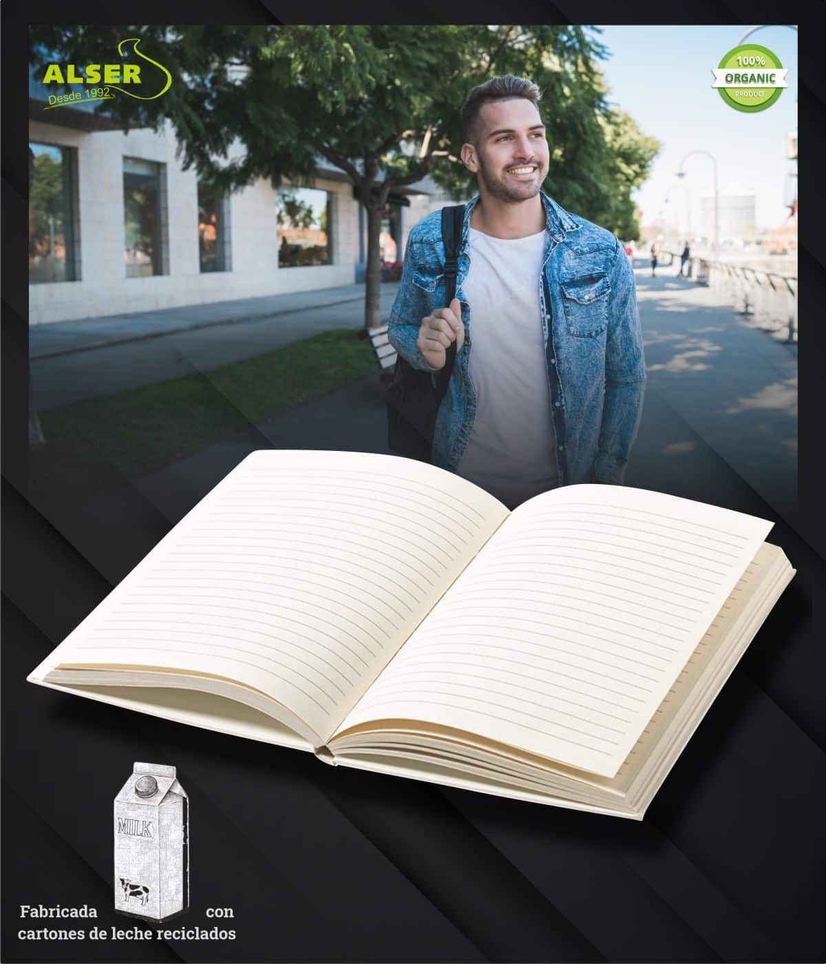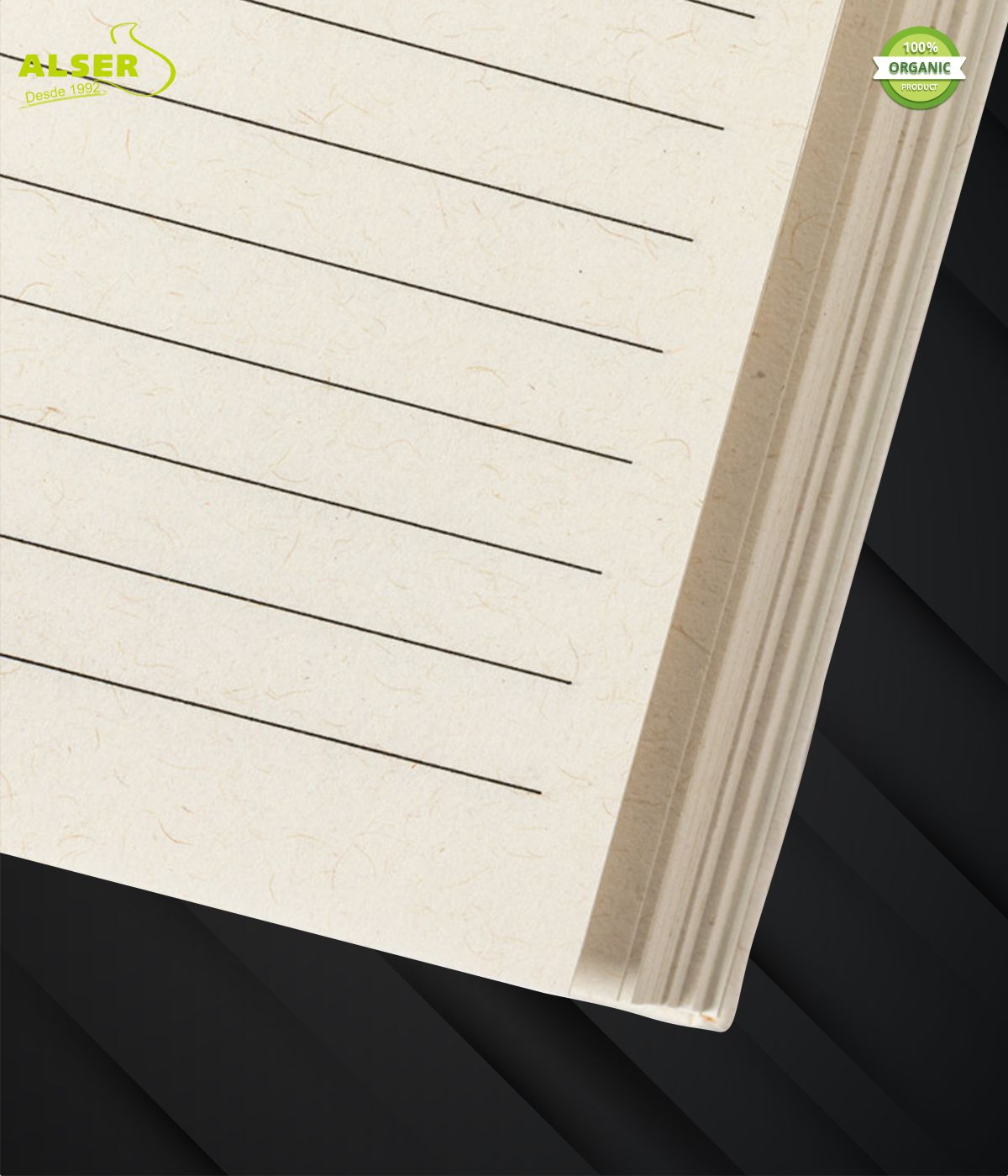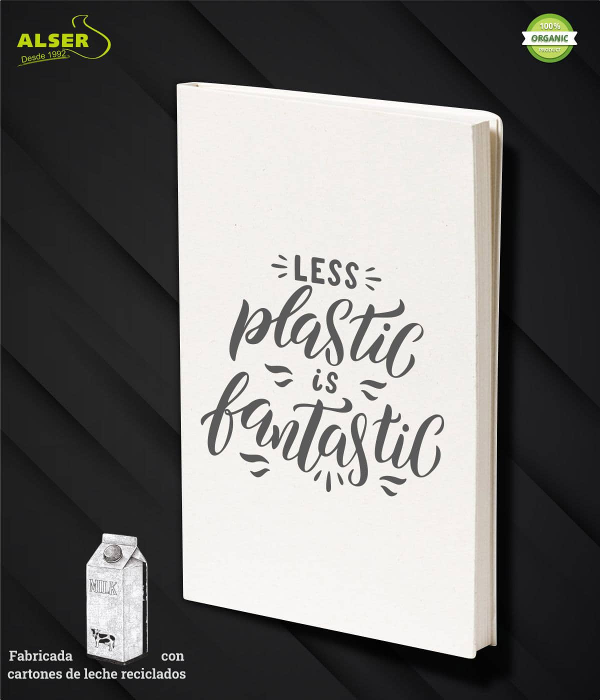 100 hojas rayadas, tapas rígidas y personalizable con tu logotipo para tus promociones más ecológicas y sostenibles.