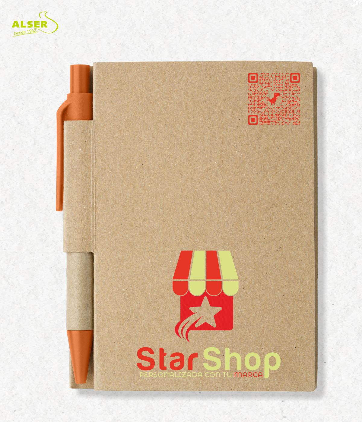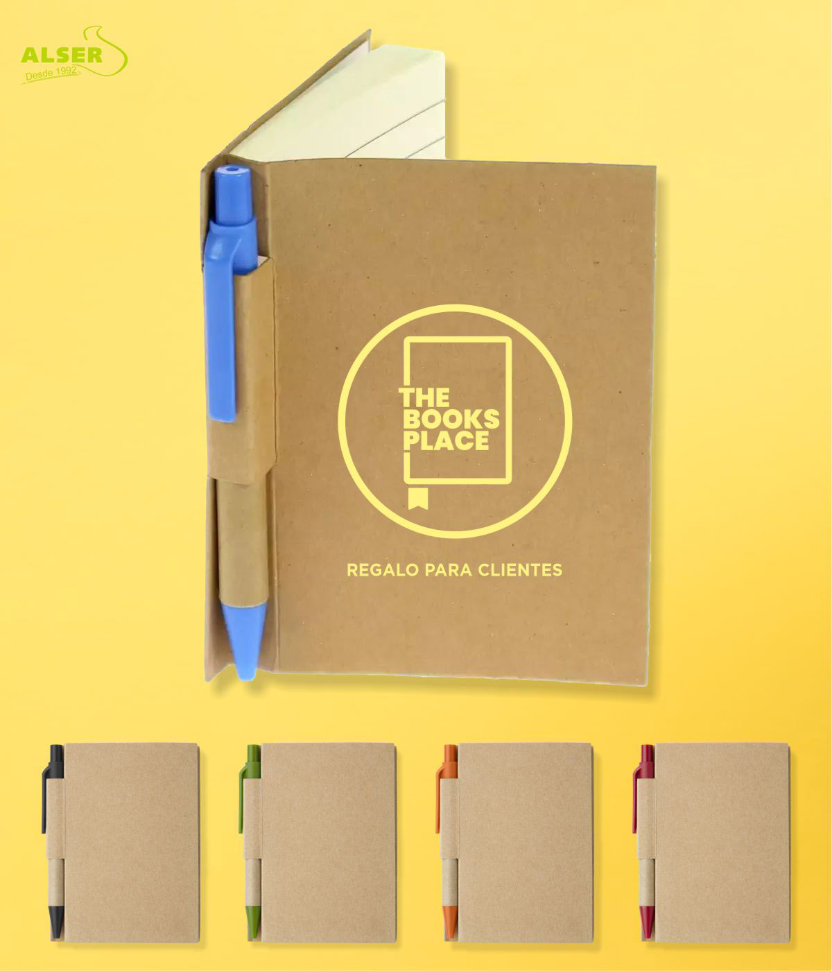 Incluye un bolígrafo de cartón reciclado con tinta negra y terminales de colores variados: azul claro, naranja, rojo, verde o negro. Además, tiene su espacio reservado en el lateral del bloc, para que nunca se pierdan el uno al otro. Son el dúo dinámico de las promociones sostenibles.