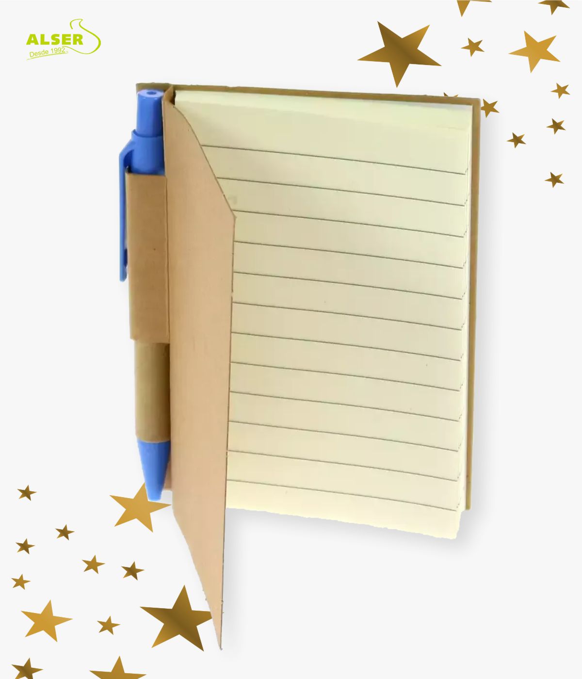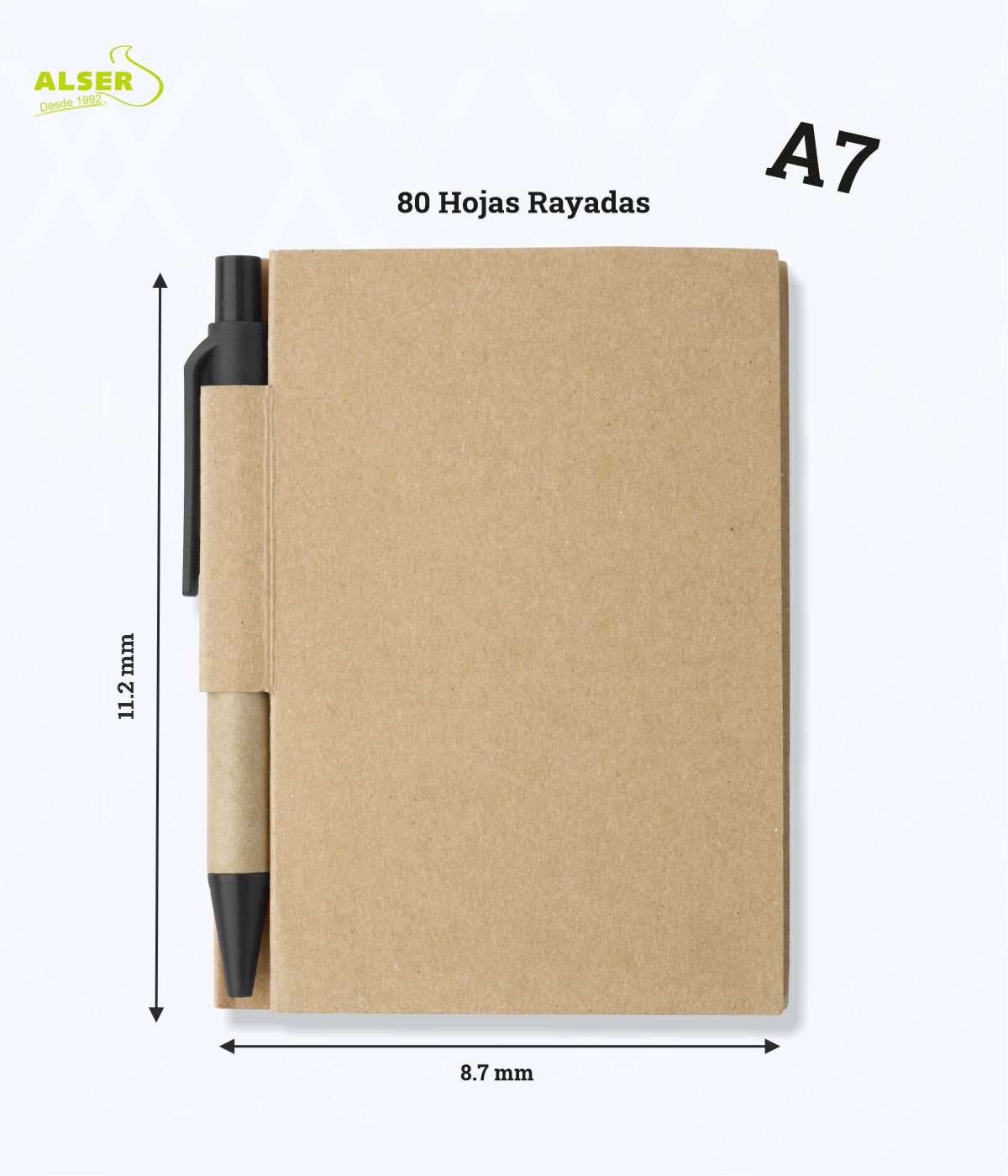El tamaño importa, y el bloc A7 publicitario es la prueba de que lo pequeño puede ser muy efectivo. Sus tapas de cartón natural comunican sostenibilidad, sus hojas lineadas invitan al orden y su bolígrafo a juego completa un conjunto práctico y con buena imagen.