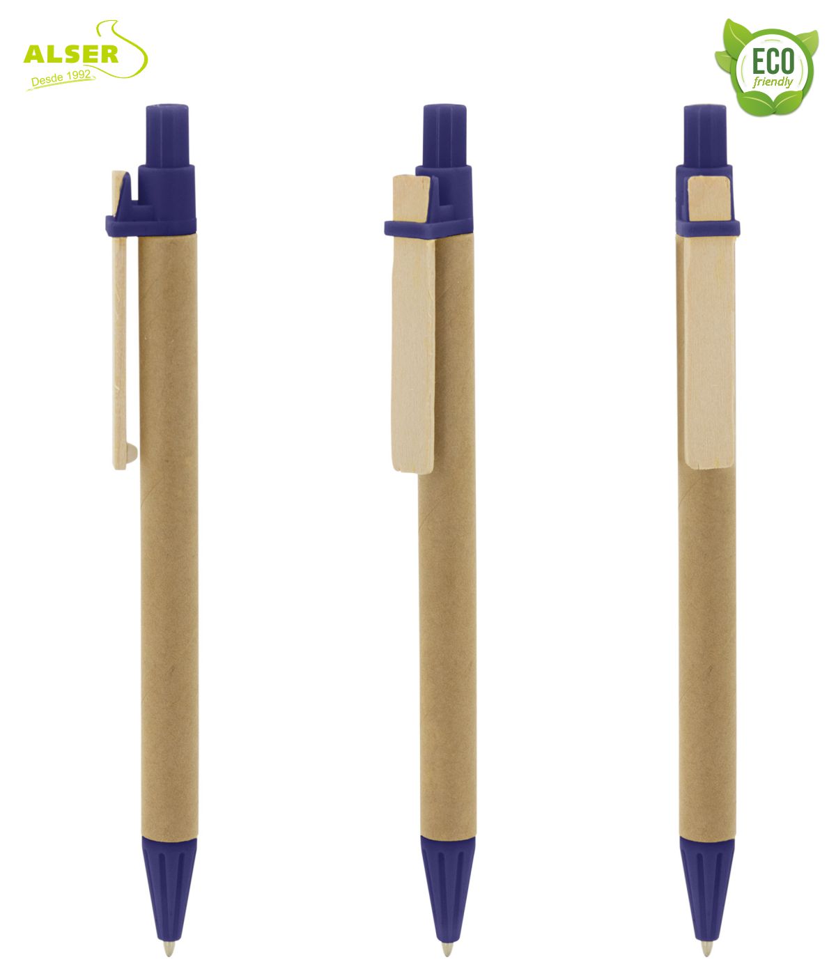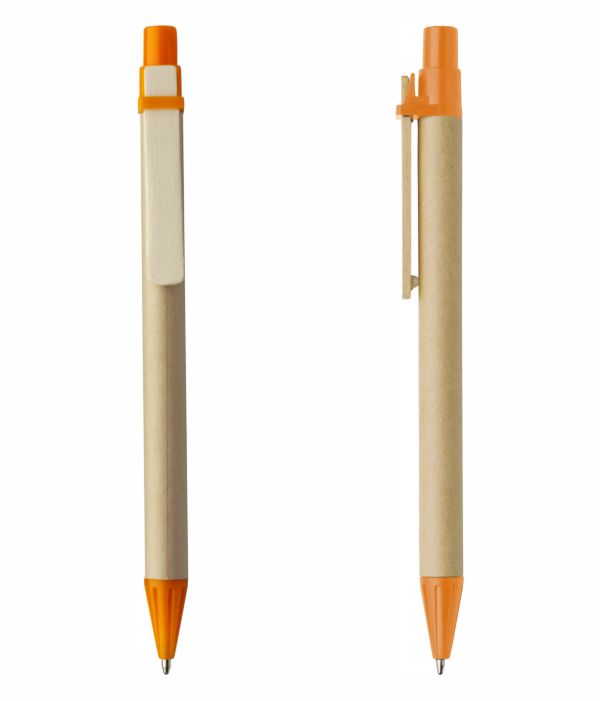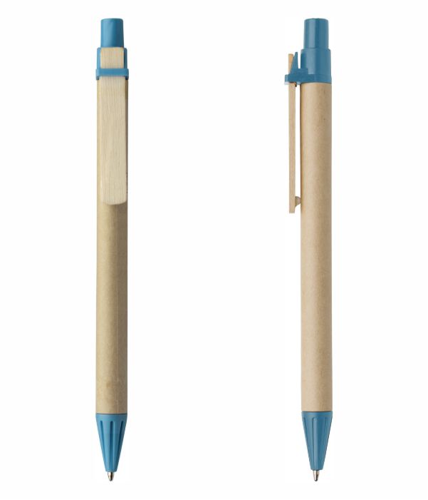 Bolígrafo ecológico promocional con caña de cartón y clip en madera, dos materiales que le dan una buena sintonía con el medio ambiente