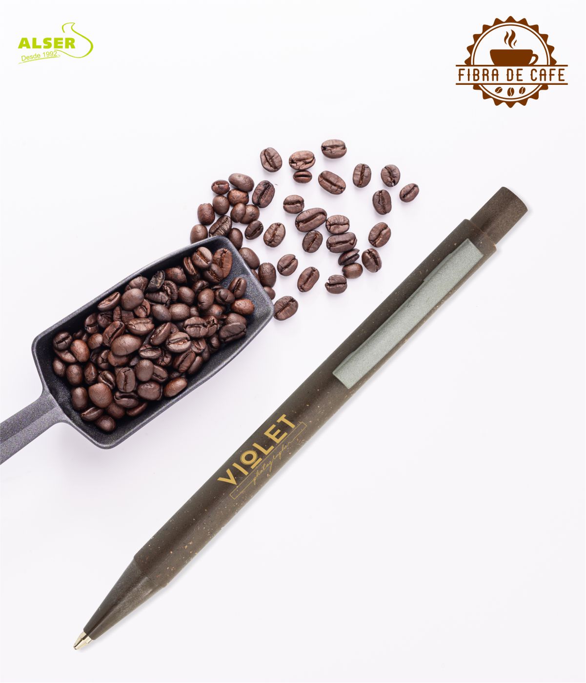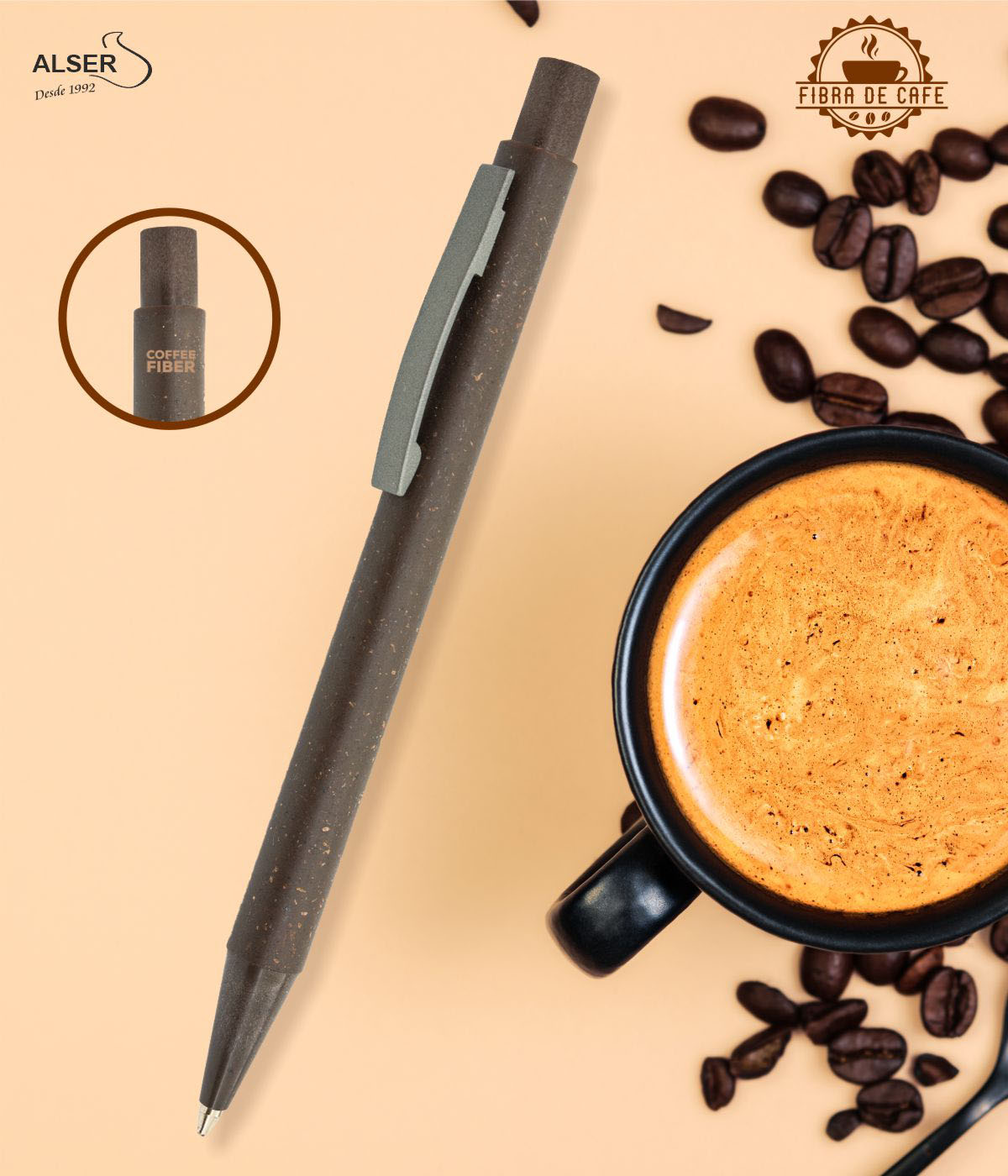 El bolígrafo fabricado en fibra de café es sostenible y ahonda en la economía circular aprovechando los posos y restos no usados de las plantas de café.