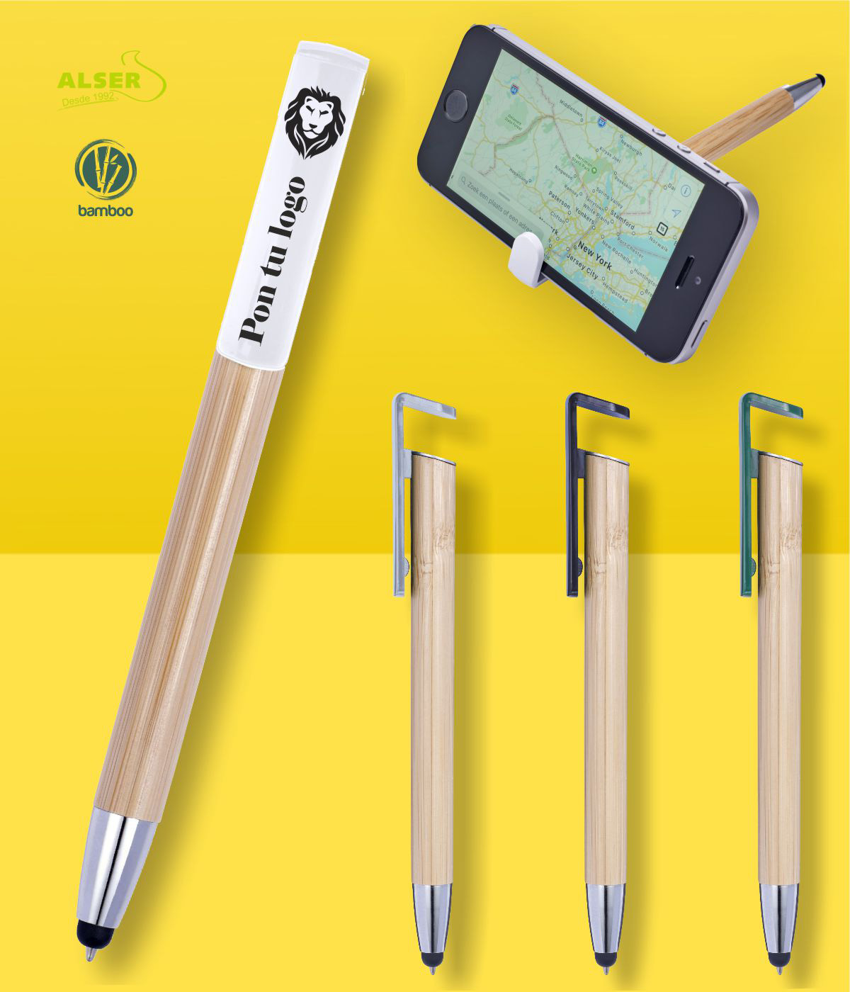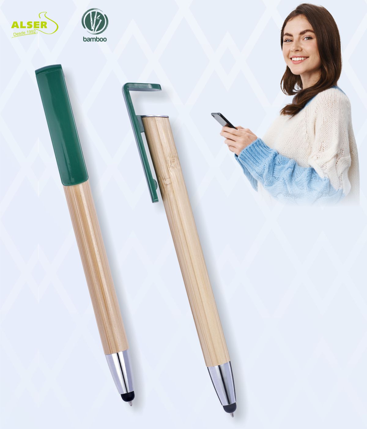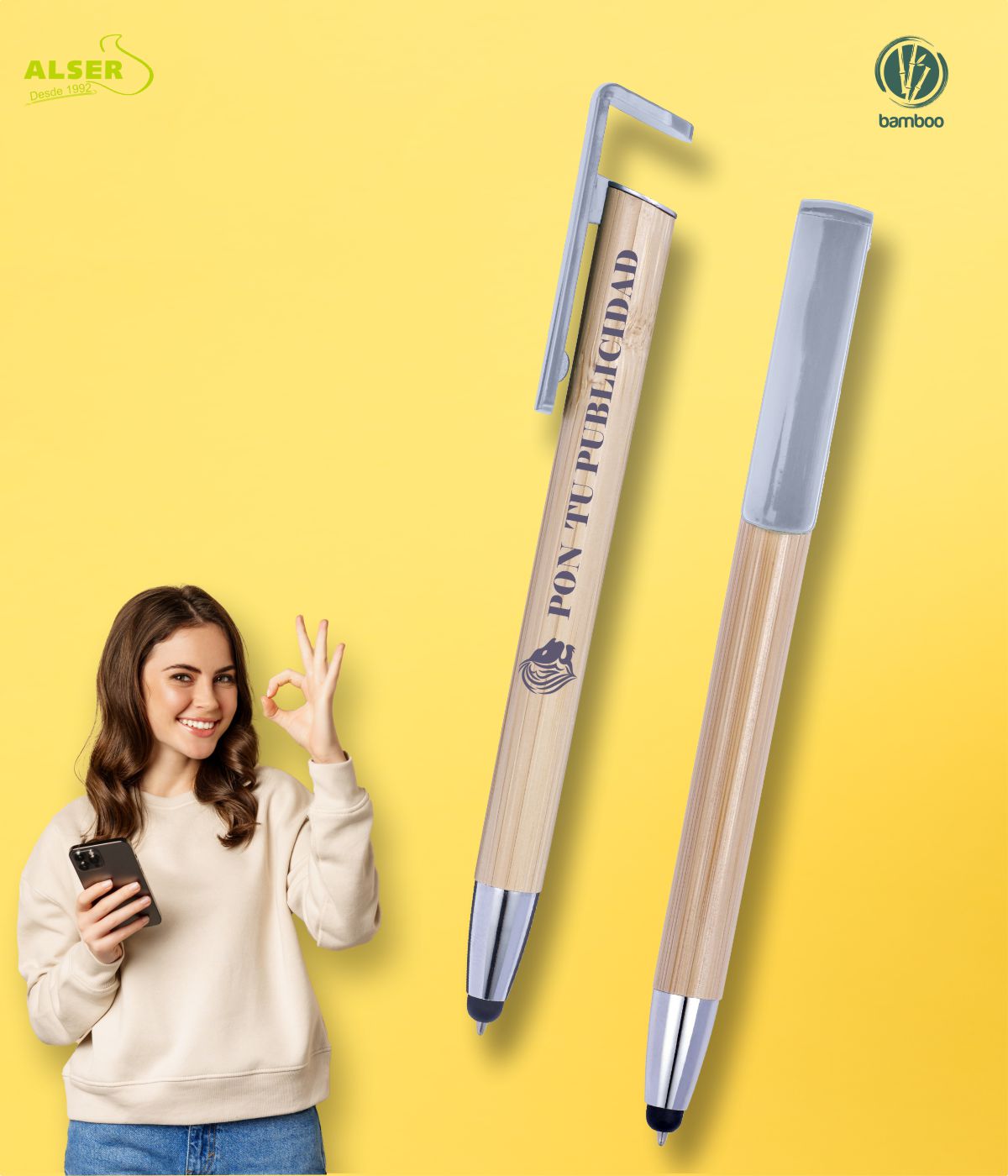 No solo sigue siendo una gran idea para llevar siempre a mano un bolígrafo con soporte para móvil, ahora además, es sostenible con el medio ambiente, y muestra una imagen más natural siendo, además, extremadamente suave, gracias al bambú con el que está fabricado.