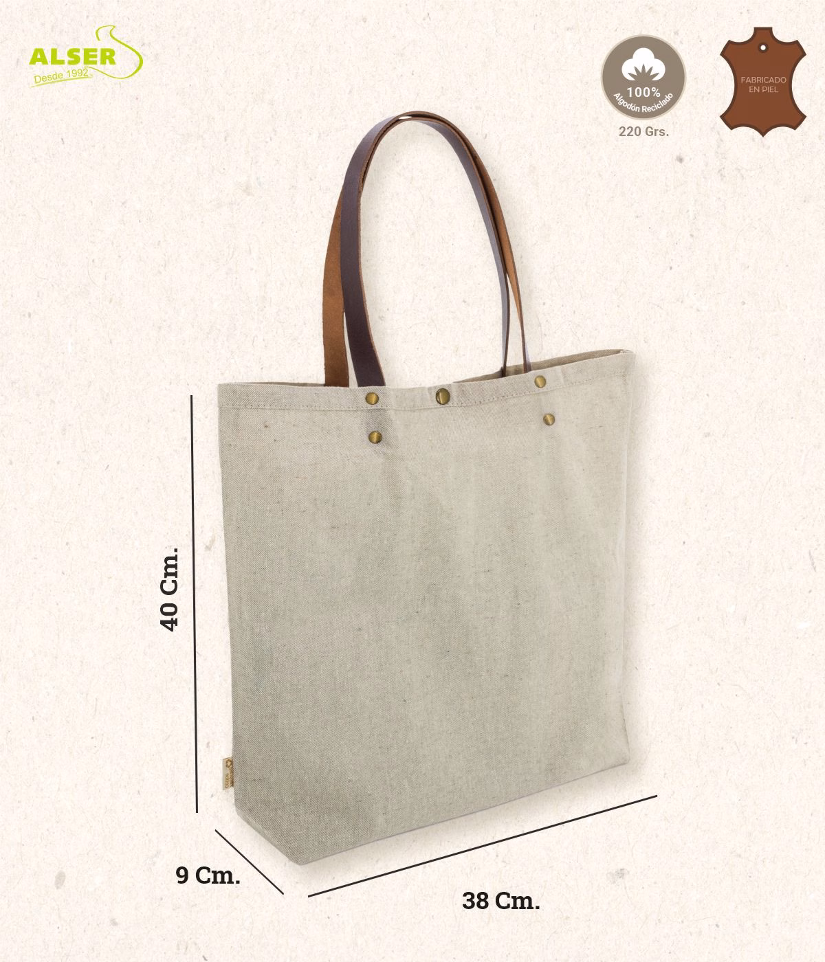 ¿Qué la hace única? Su tejido de algodón reciclado no solo evita la acumulación de humedad (¡adiós a los malos olores!), sino que soporta peso sin deformarse. Las asas de piel con remaches metálicos garantizan agarre seguro, incluso con cargas intensas, y el cierre de botón corchete añade un toque industrial chic. ¿Personalización? Máxima. Elige entre serigrafía a un color o transfer digital a todo color, y aplica tu logo en una o ambas caras para multiplicar la visibilidad. Con medidas 38x40x9 cm, es espaciosa sin perder su estilo minimalista.
