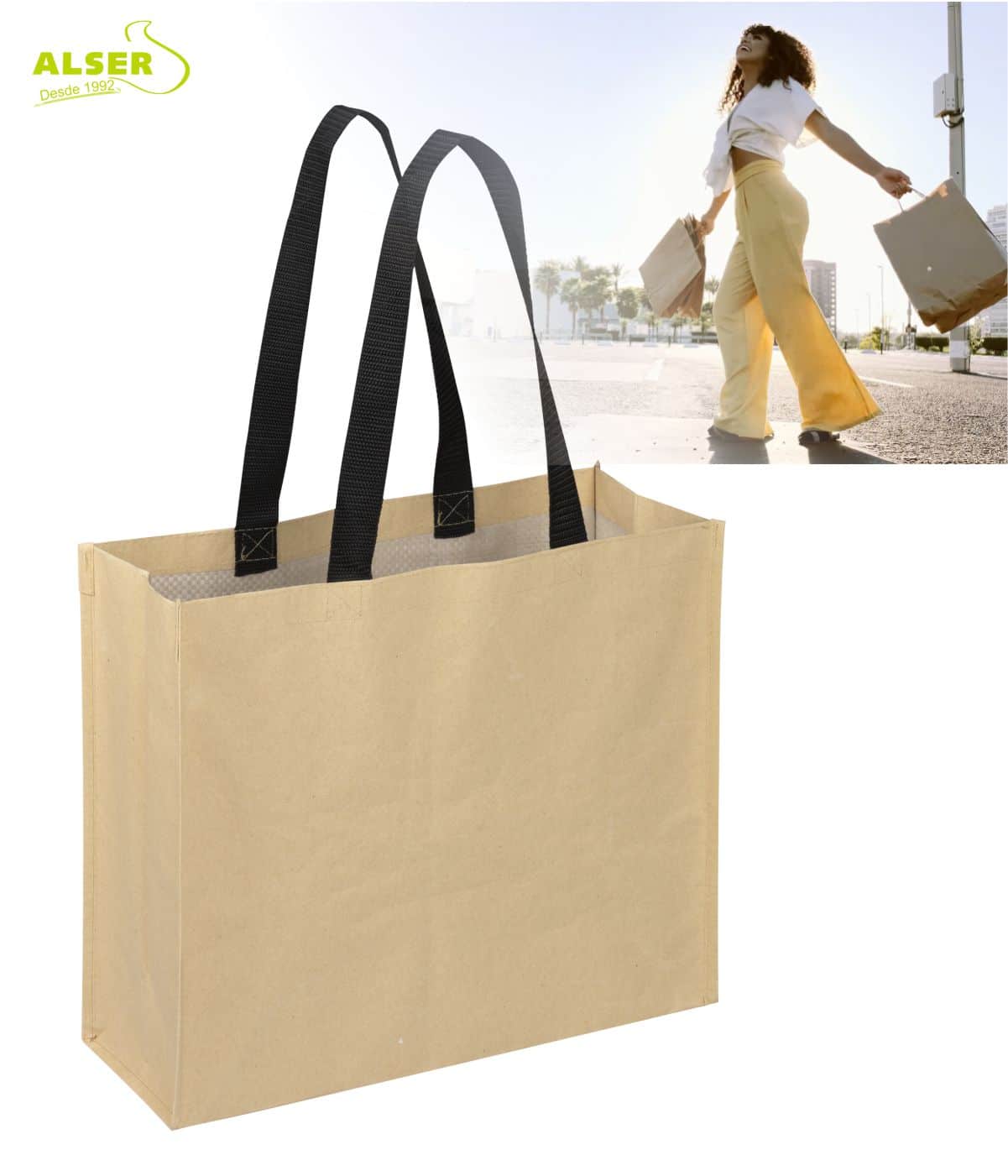 • Bolsa fabricada en papel Kraft de doble capa e interior recubierto en polipropileno.