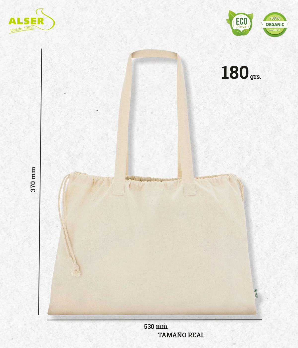 Fabricada en algodón orgánico de 180 g, cultivado sin químicos ni pesticidas, esta bolsa es un guiño directo a la sostenibilidad. Su cordón autocierre del mismo material no solo es práctico, también le da ese aire clásico que inspira confianza. Y ojo, porque hablamos de un modelo extra grande: aquí cabe desde la compra semanal hasta todo lo que necesitas para una escapada de verano.
