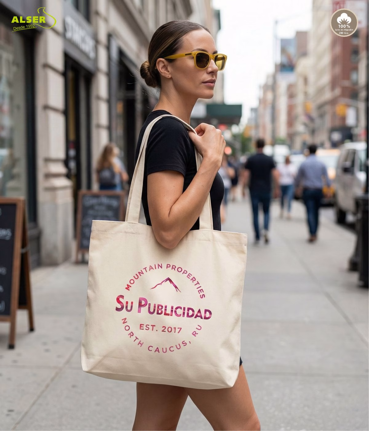 Porque es la típica bolsa que llevas una vez… y ya no puedes soltar. Porque cabe todo, aguanta el ritmo, no se rompe con mirarla (hola resistencia de 280g/m²), y tiene ese bolsillo interior que salva vidas cuando necesitas encontrar algo rápido. Además, cuando la llevas con tu logo, ¡te sientes parte de algo grande! Es práctica, bonita y con valores. ¿Qué más se le puede pedir?