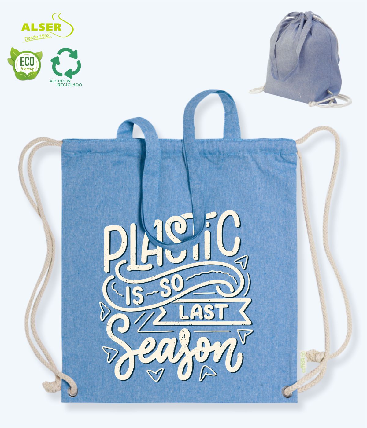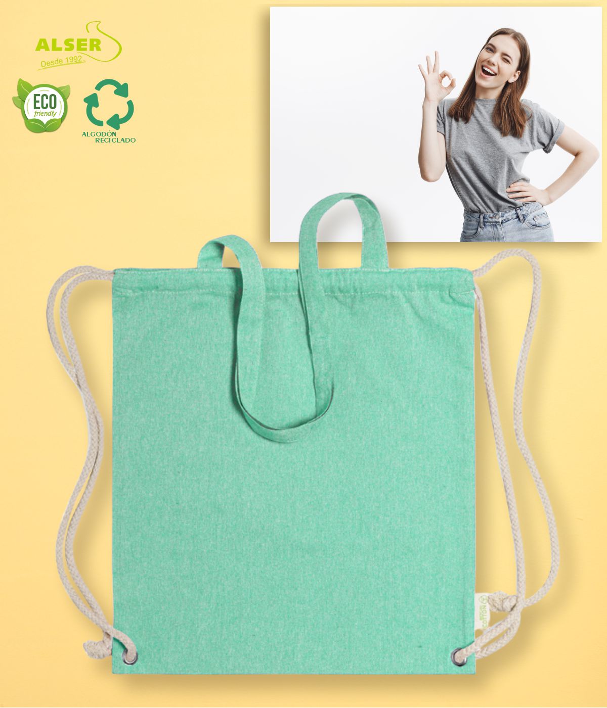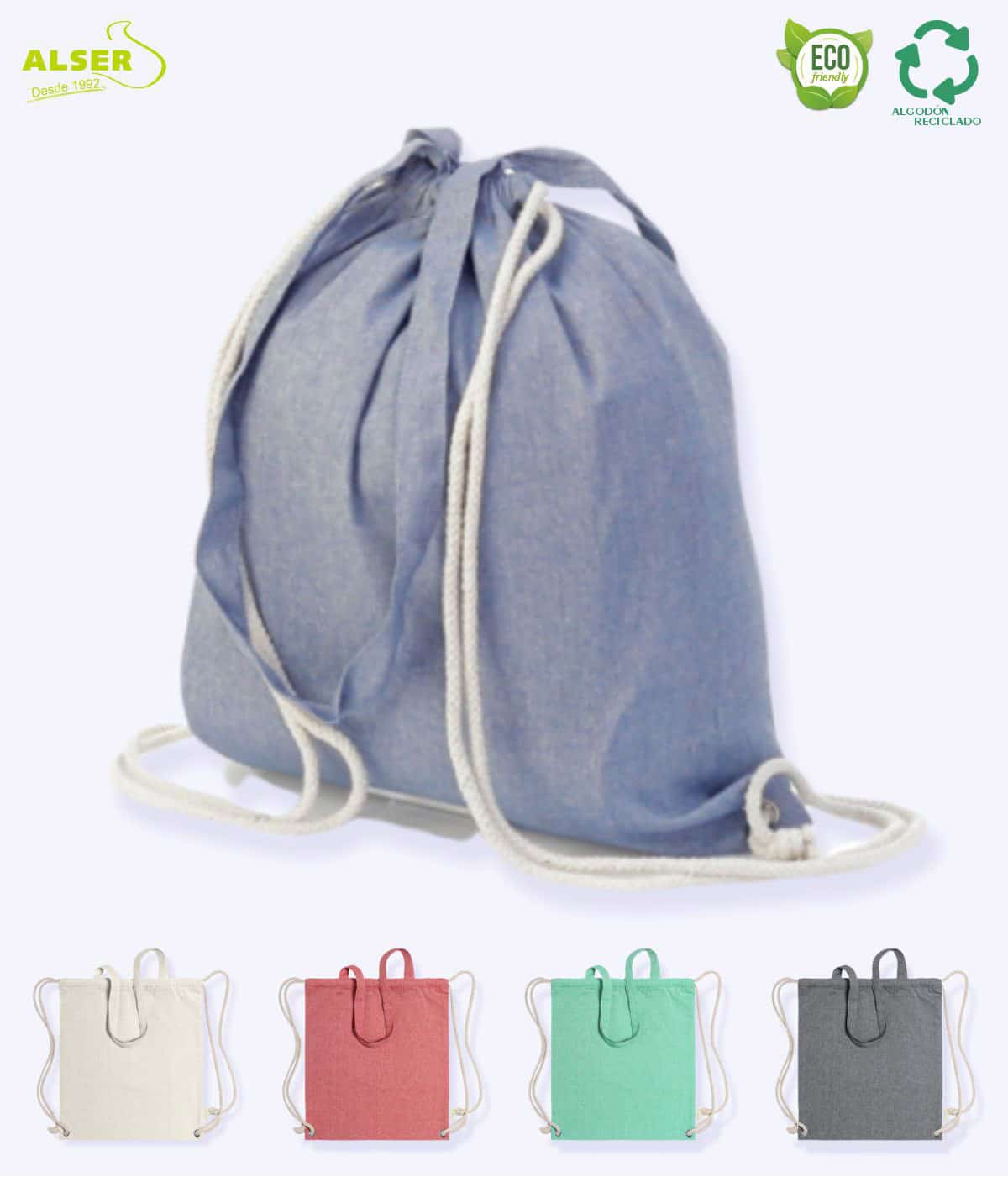 Y es que esta bolsa mochila de tela derrocha el estilo desenfadado de su algodón reciclado, y de la originalidad de su combinación de productos.