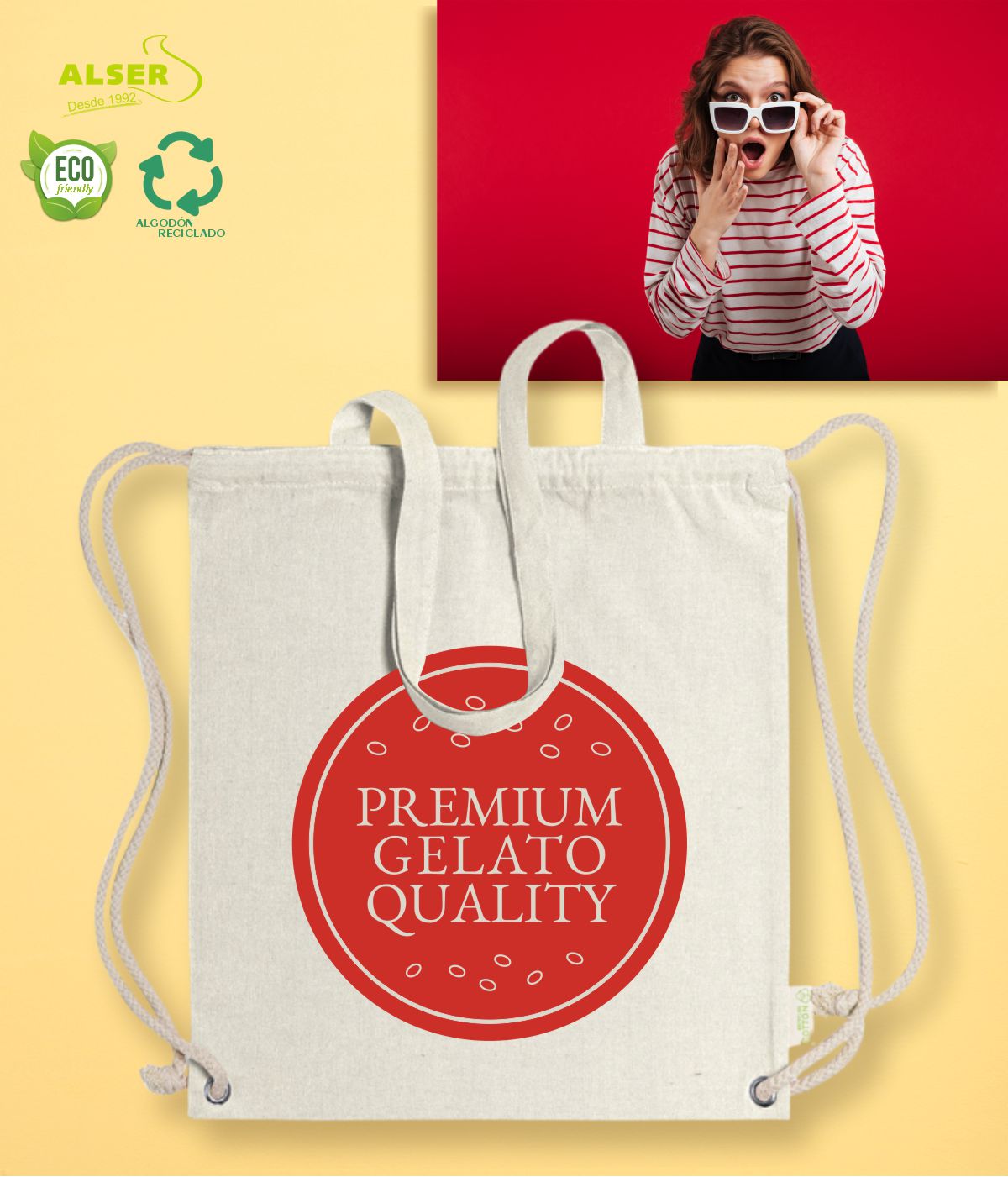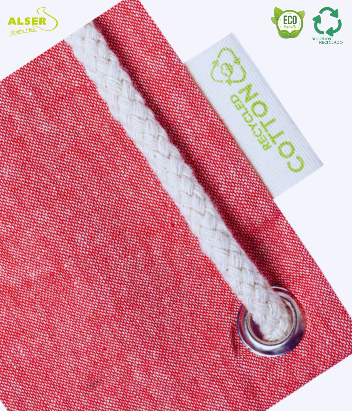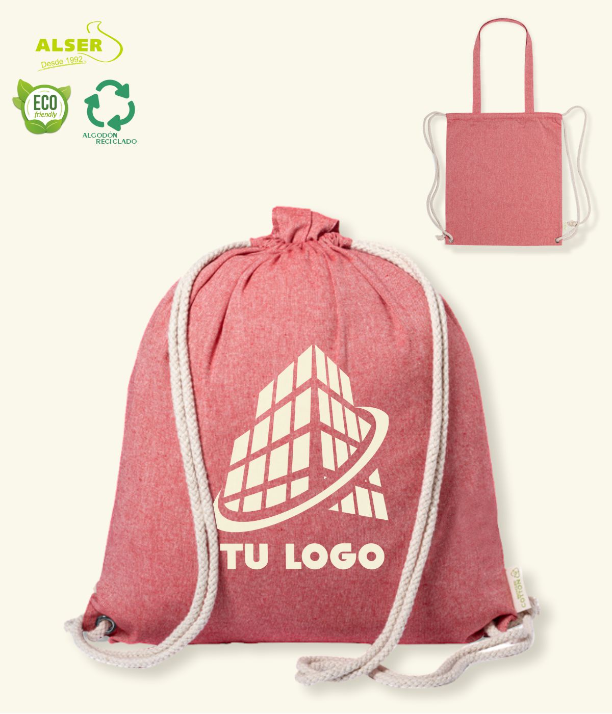 Y es que esta bolsa mochila de tela derrocha el estilo desenfadado de su algodón reciclado, y de la originalidad de su combinación de productos.