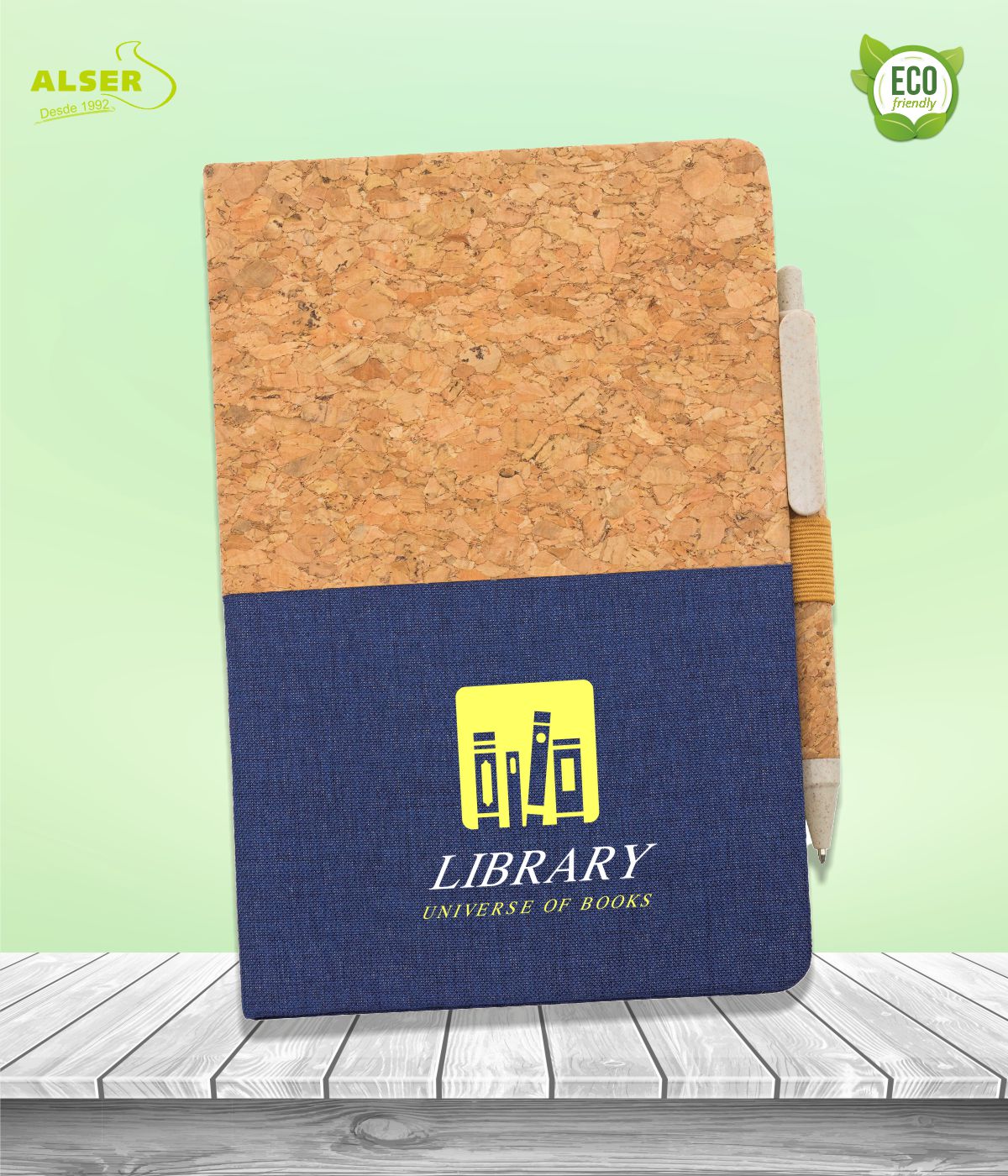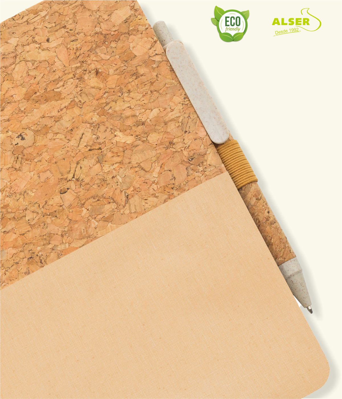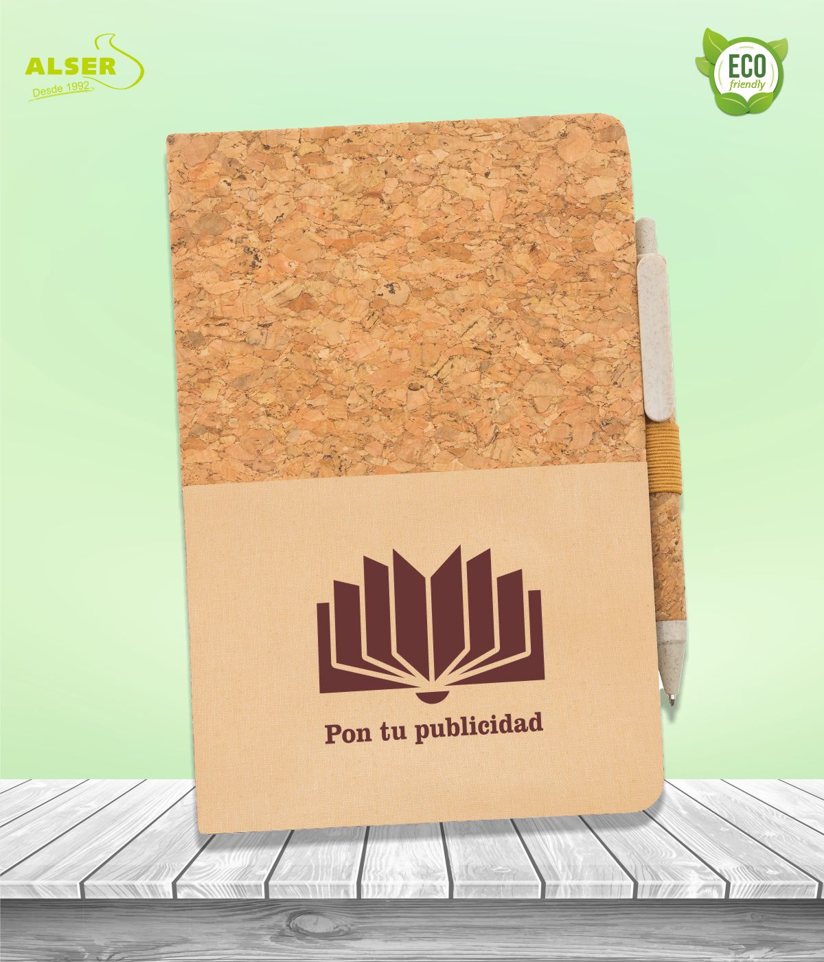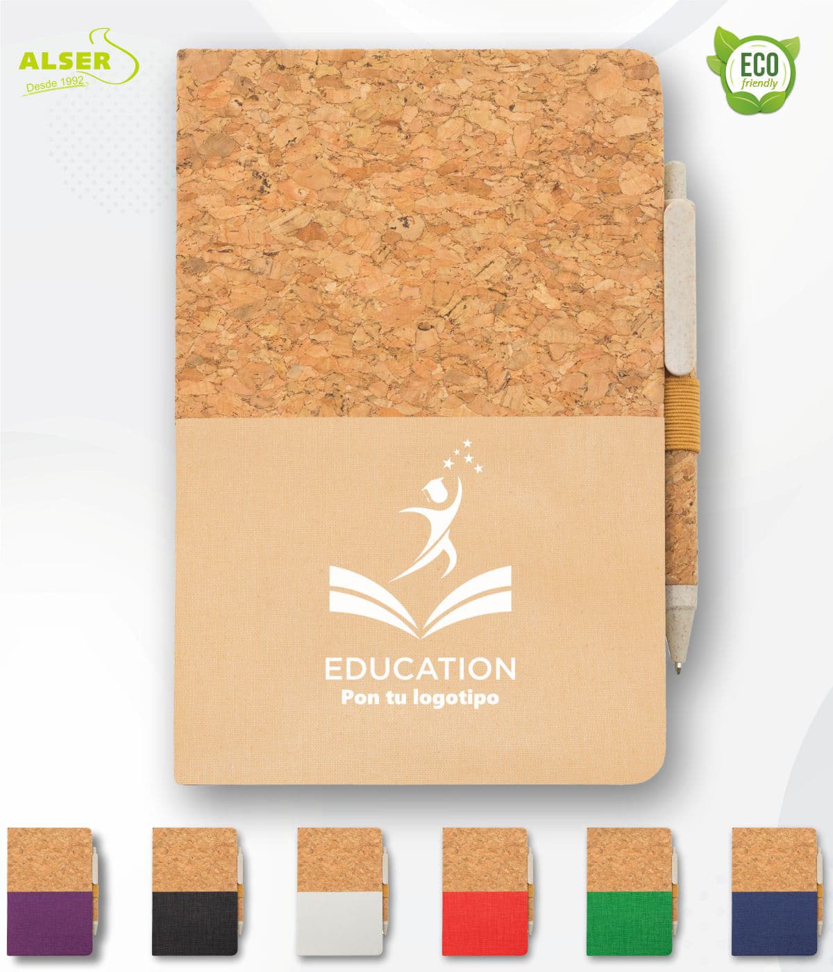 Las tapas de corcho y lino de esta libreta, le dan un toque original y colorido para poner tu publicidad.