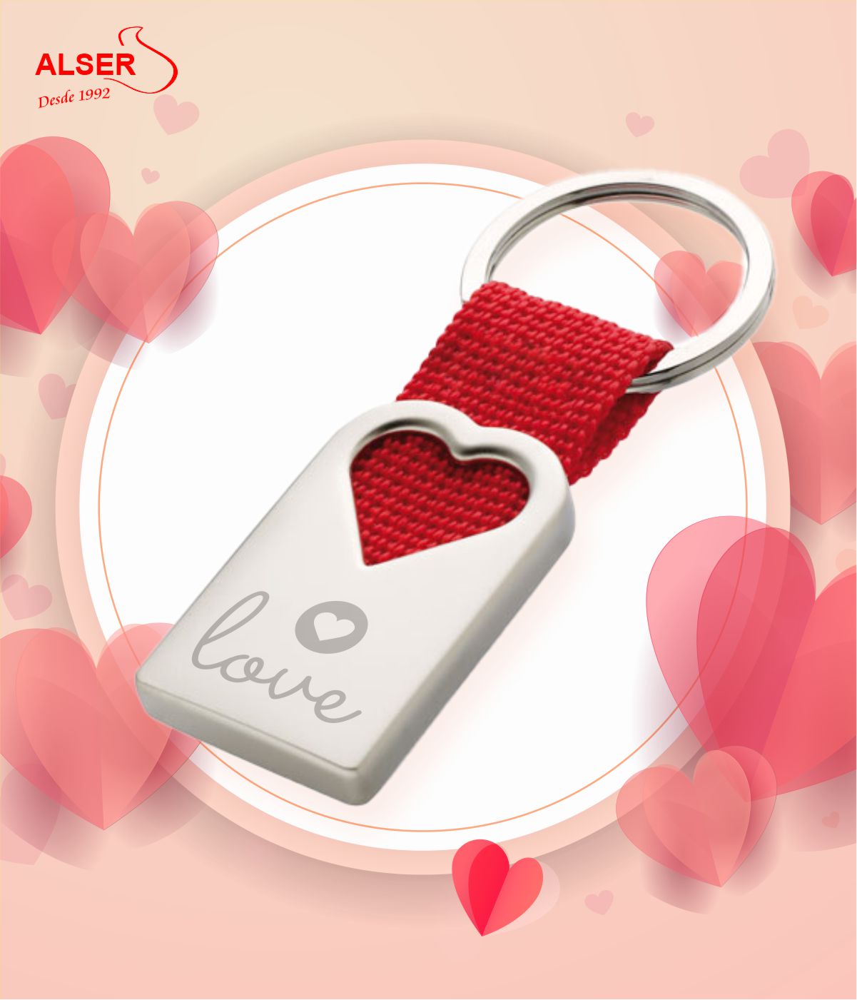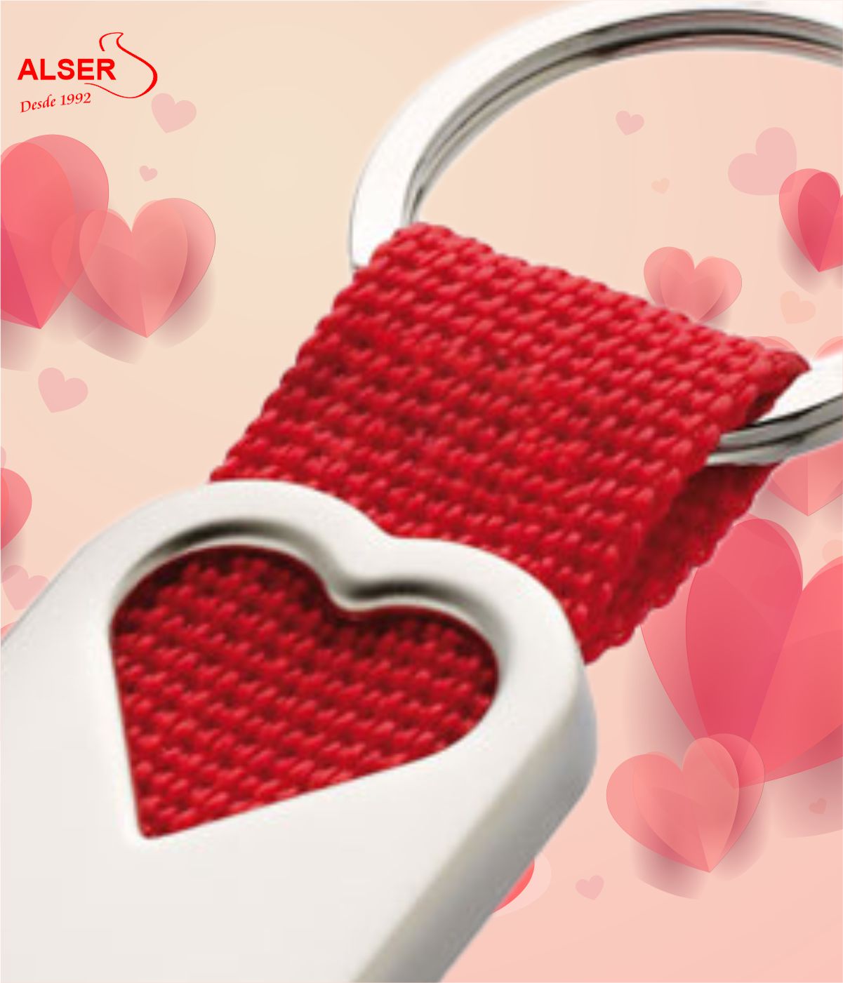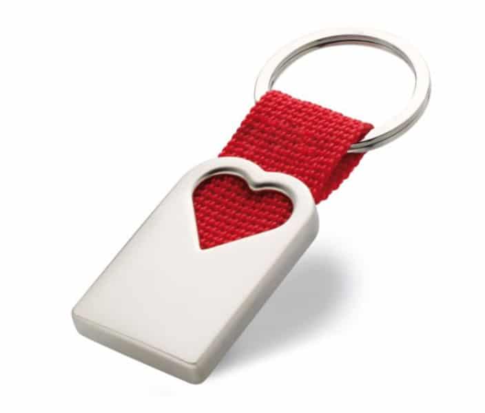 Llavero de metal en forma de corazón con acabado en efecto perla mate y con una tira de color rojo de poliéster.