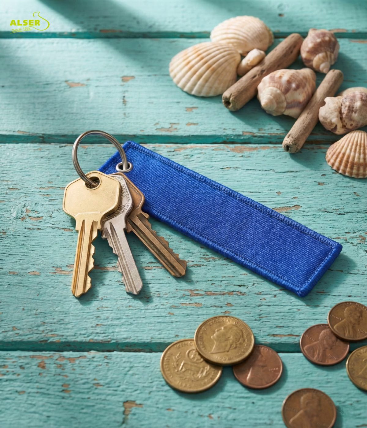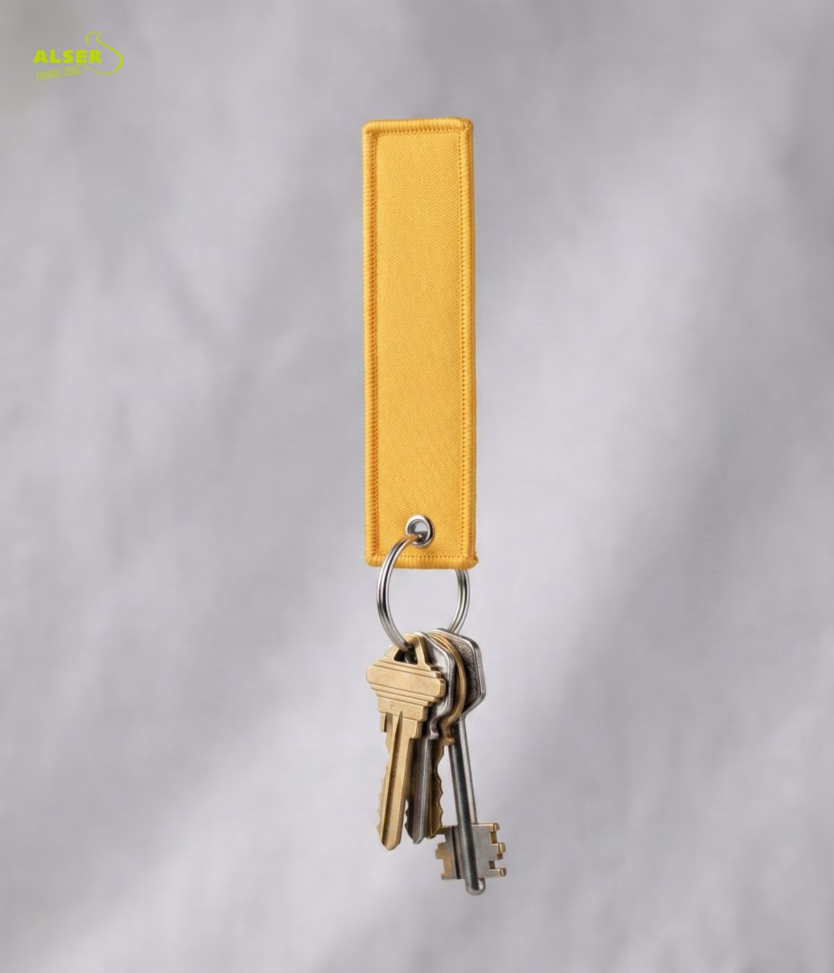 Fabricado en poliéster resistente, este llavero de tela rectangular está pensado para aguantar el ritmo diario sin perder forma ni color. Los bordes remallados con hilo a juego refuerzan el acabado y la anilla metálica mantiene las llaves bien sujetas, sin dramas ni sustos.