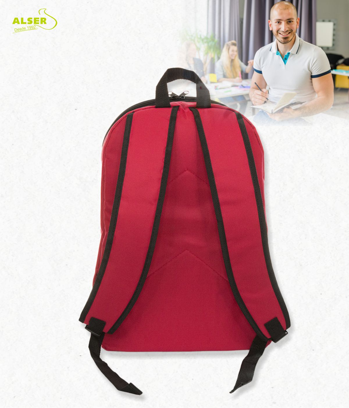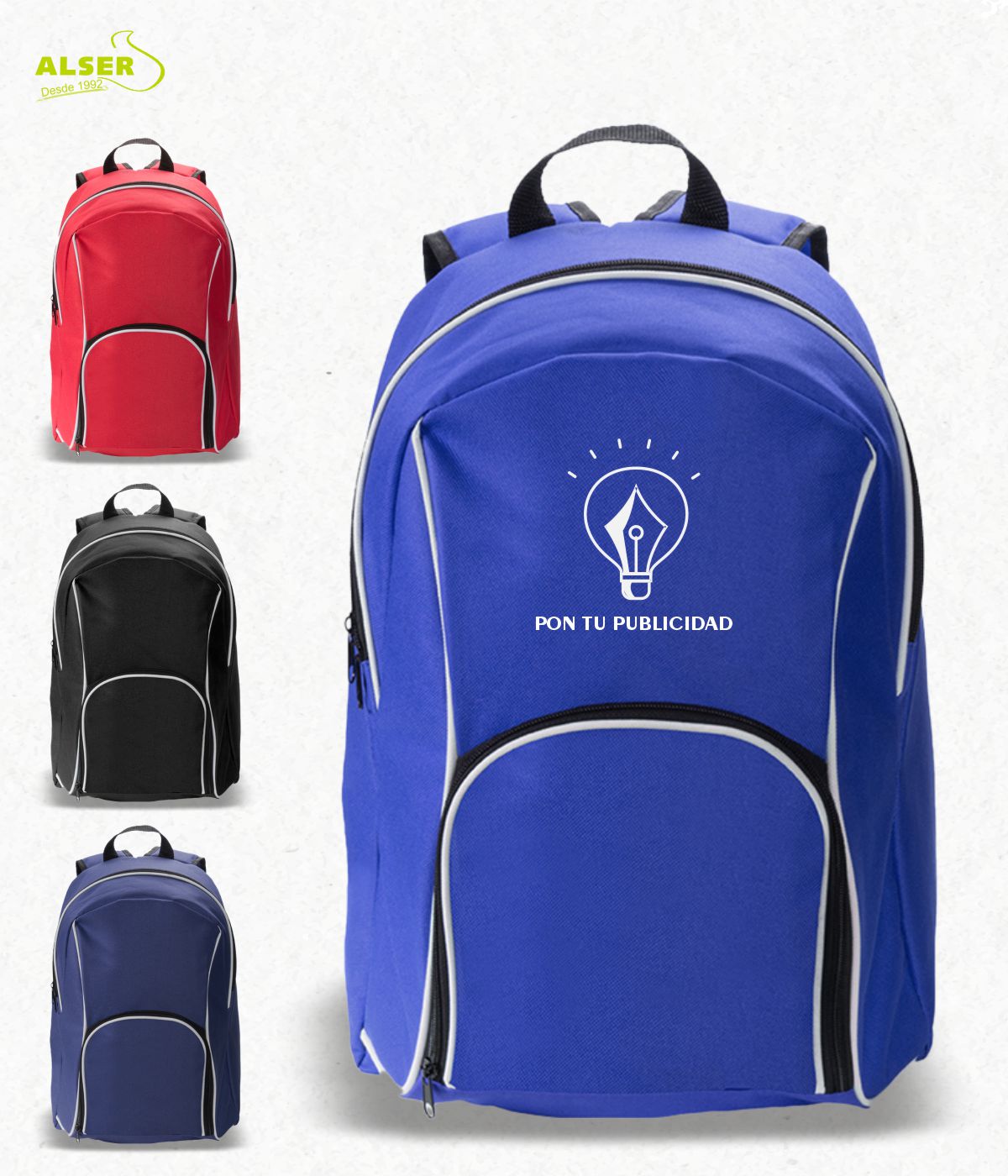 Está disponible en colores que nunca fallan: el azul y azul oscuro para los clásicos, el rojo para los valientes y el negro para los que siempre están a la última. Además, es perfecta para colegios, academias y centros educativos que quieren dejar huella. Personalízala con tu logotipo y conviértela en el accesorio estrella de los estudiantes. Es la forma perfecta de promocionar tu marca y acompañarles en su día a día.