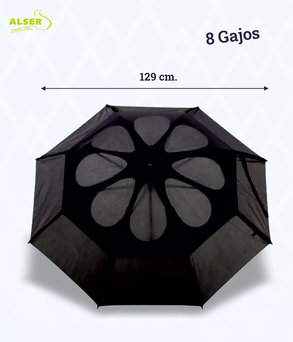 Elige entre los colores azul y negro, y aprovecha su generoso tamaño tipo golf de 129 cm de diámetro para mantener a tus clientes y trabajadores protegidos de la lluvia y el viento.