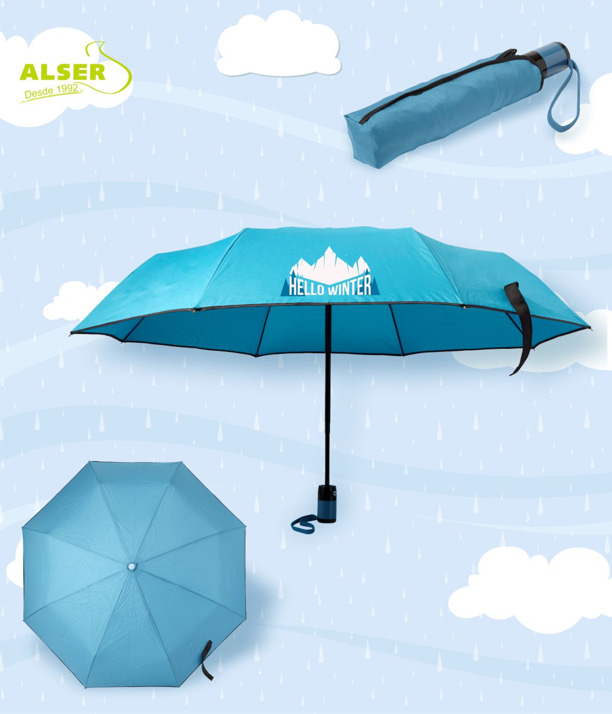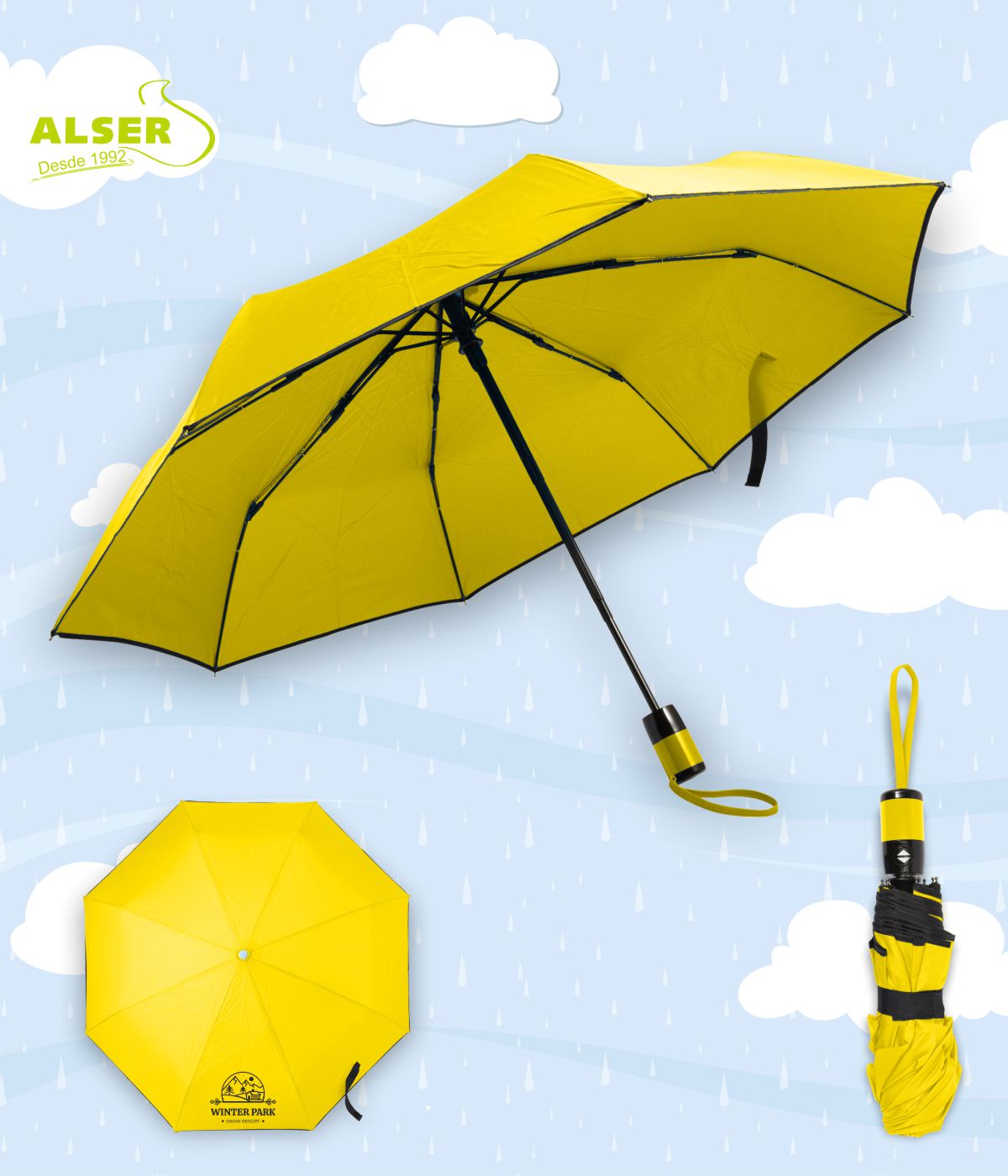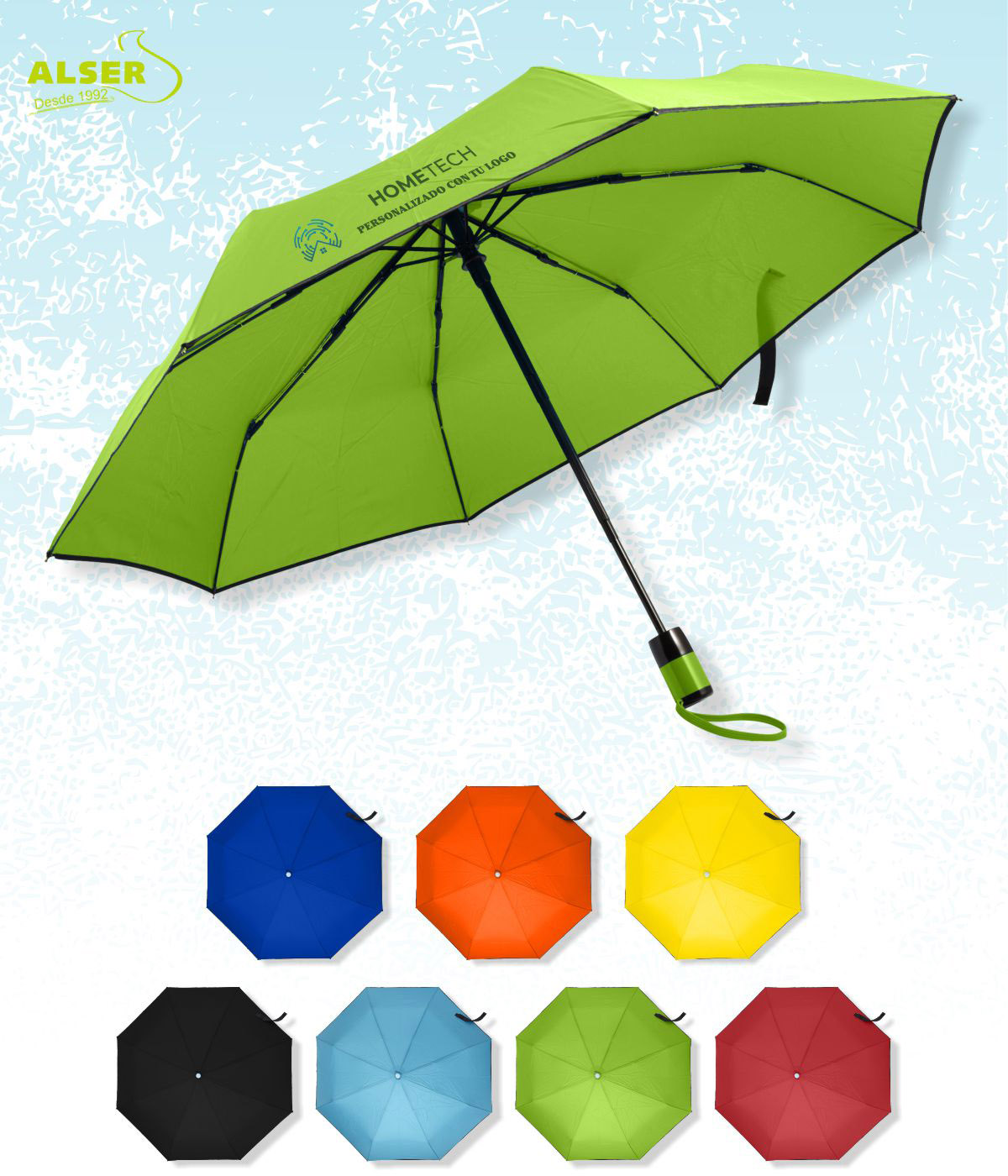 Aquí la lluvia juega a tu favor: cada paraguas personalizado da una enorme visibilidad a tu negocio. Disponible en una paleta de colores vivos —amarillo, azul, rojo, verde, naranja, negro o azul claro—, puedes personalizarlo en serigrafía hasta dos tintas o con transfer a todo color. Y lo mejor, incluye funda a juego que también puedes estampar, para que la publicidad viaje aún más lejos.