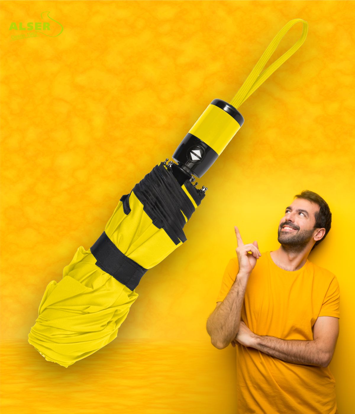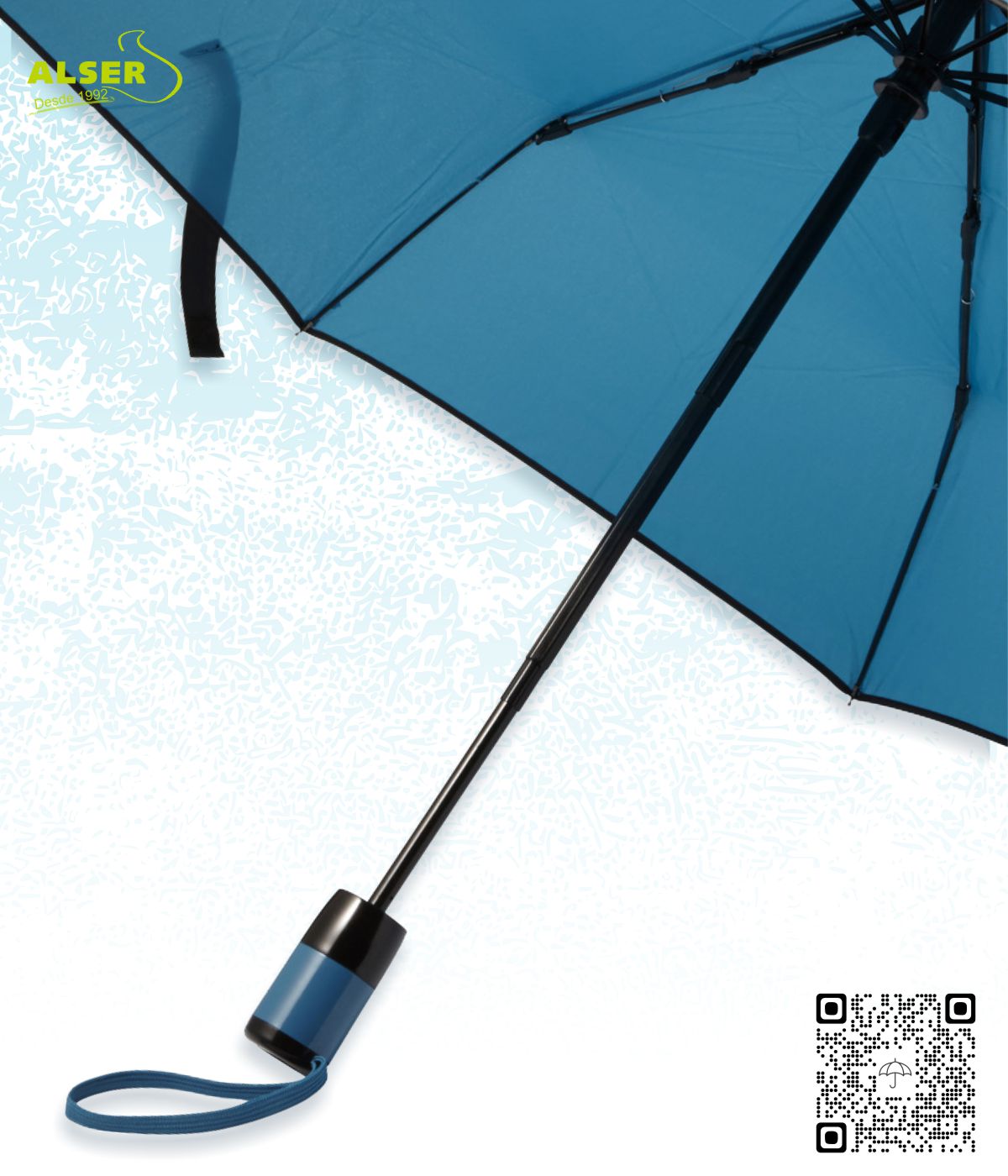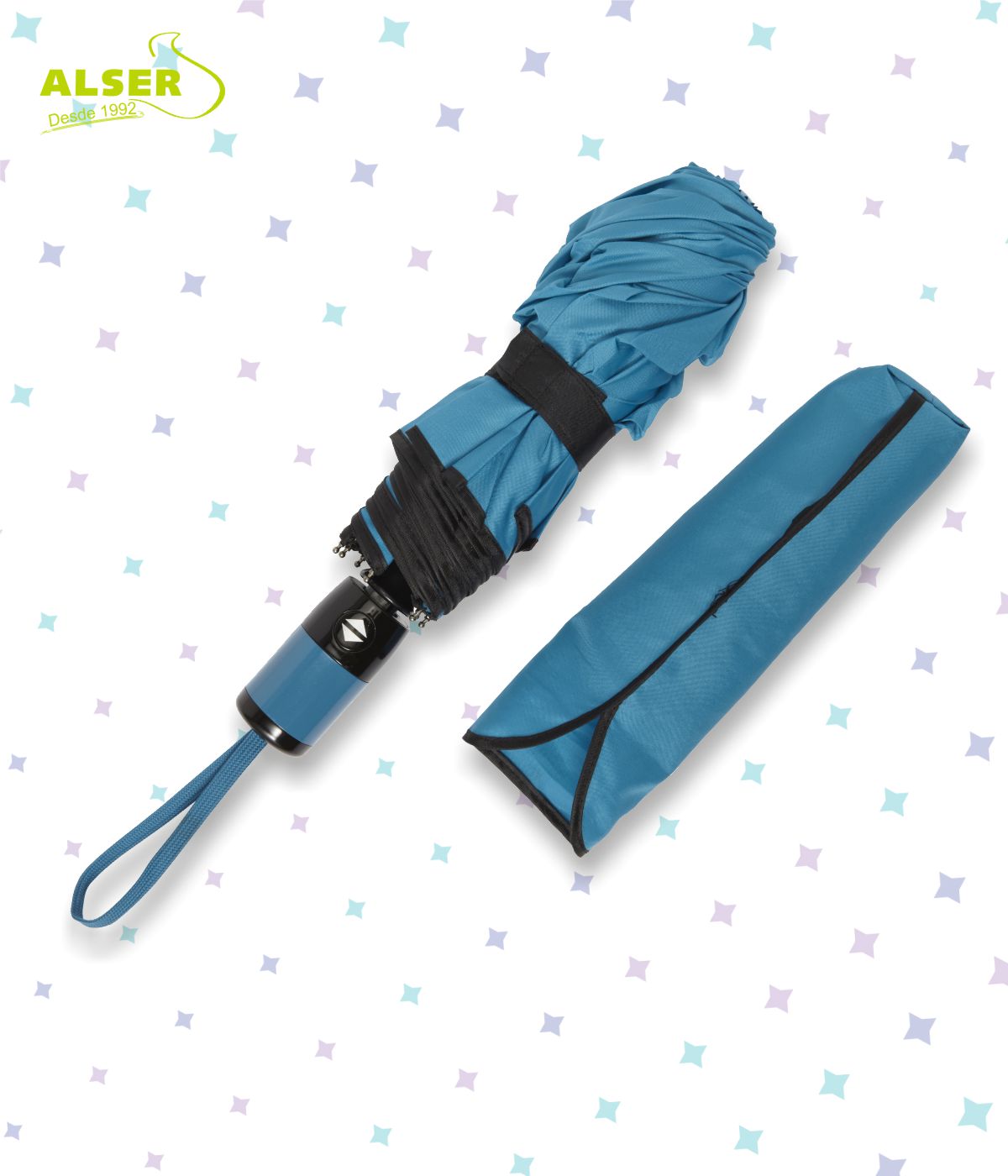 Fabricado en resistente tela pongee de 8 paneles, con estructura metálica negra y varillas de fibra de vidrio, este paraguas automático plegable es tan robusto como elegante. Se abre y se cierra con solo pulsar un botón, gracias a su mango ergonómico con detalle a color y cordón de agarre a juego. Compacto al plegarse, cabe en cualquier bolso o mochila, lo que lo convierte en el compañero ideal para el día a día.