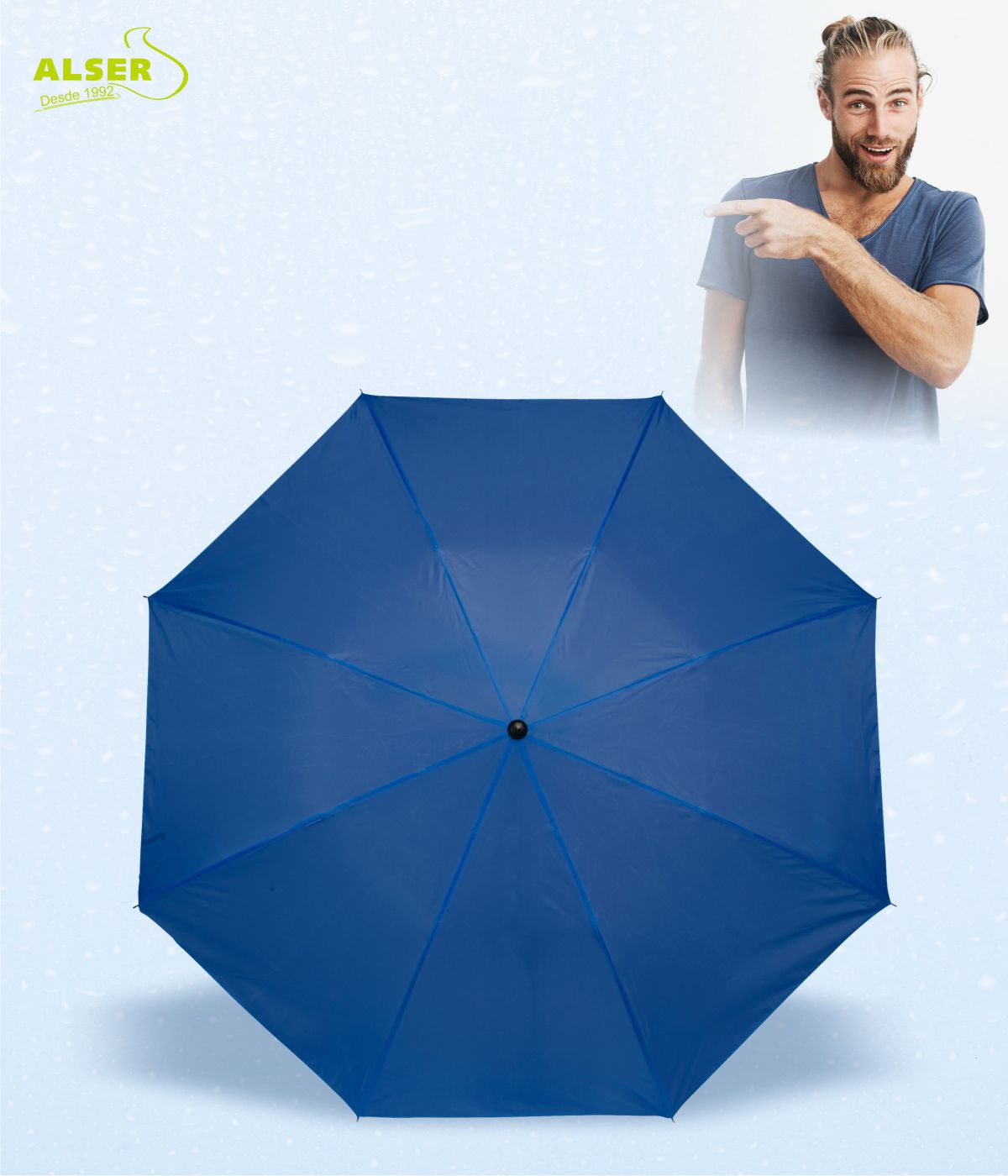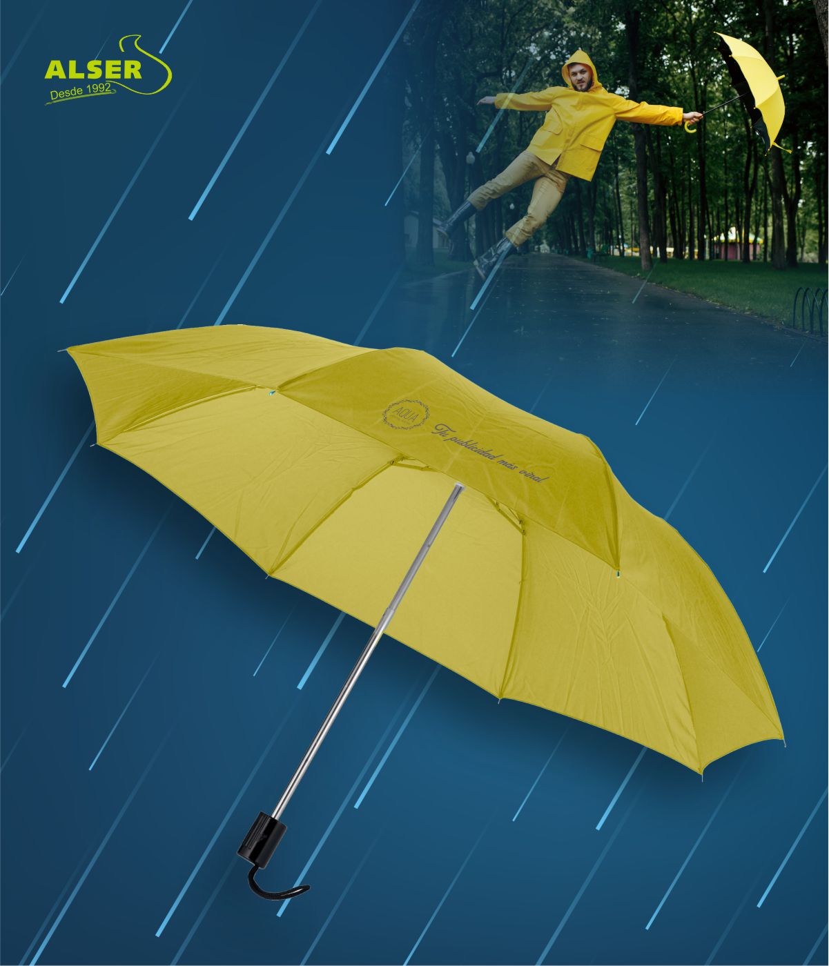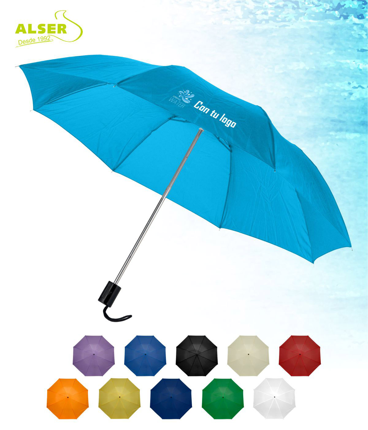 La personalización es clave. Desde tu logotipo en cuatricromía hasta la funda del paraguas, cada detalle cuenta.