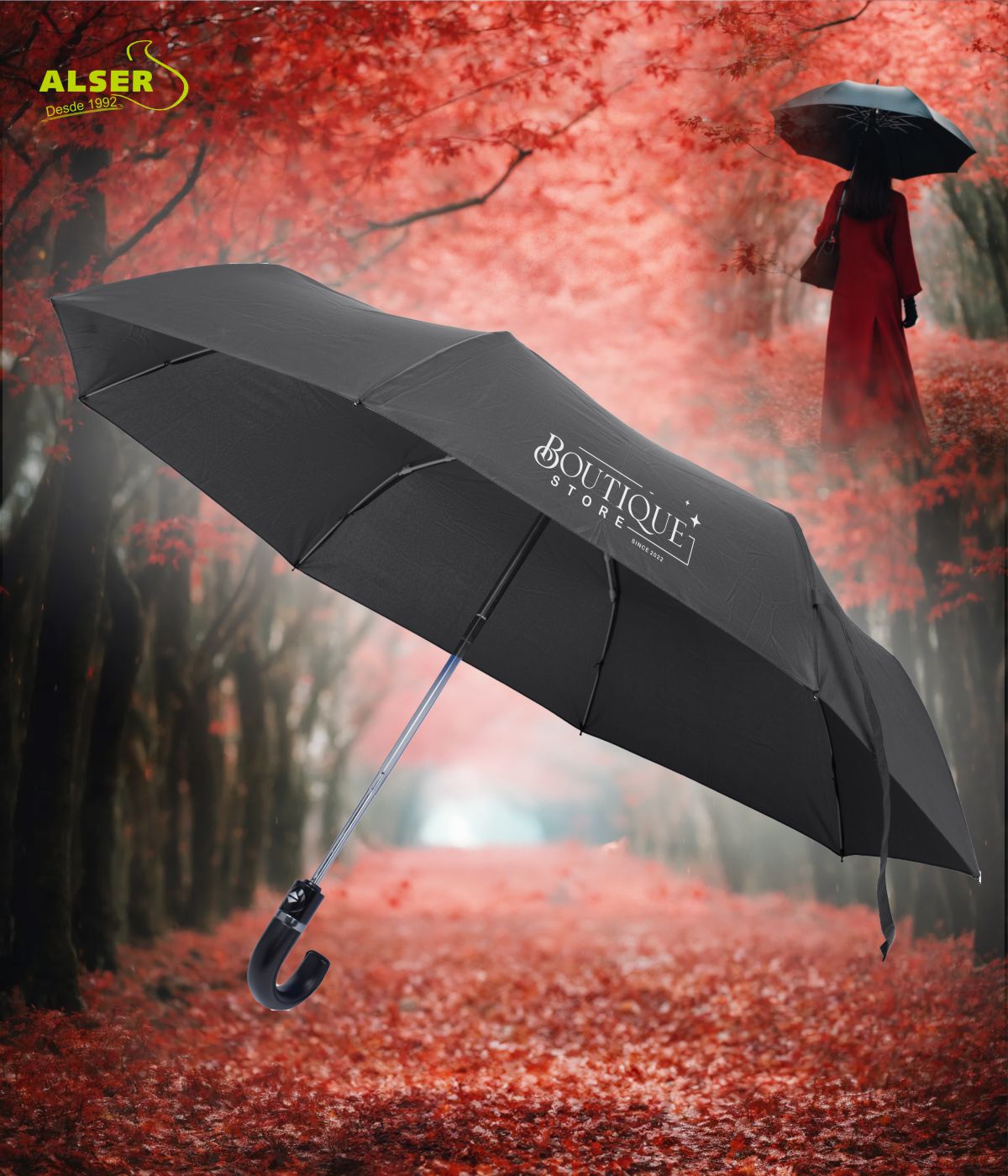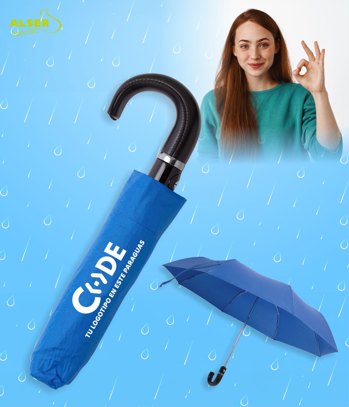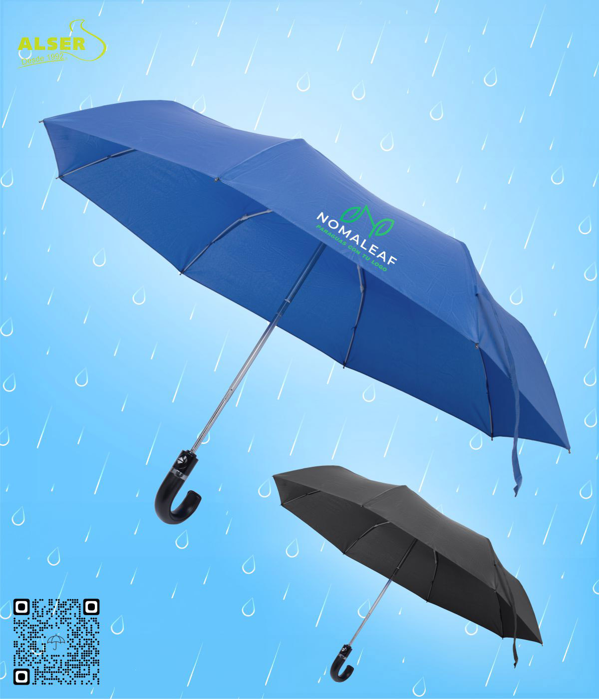 • La posibilidad de personalizarlo en el gajo del paraguas y en la funda, lo que lo convierte en un accesorio único y personal de tu negocio.