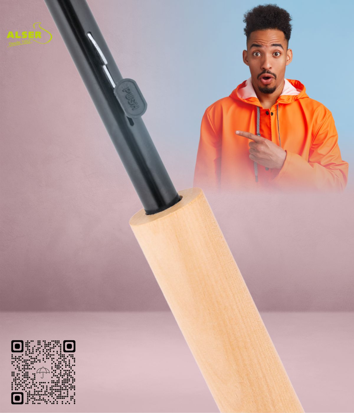 • Estilo y Resistencia: Su elegante mango de madera y varillas de fibra en negro le dan un toque de sofisticación.
