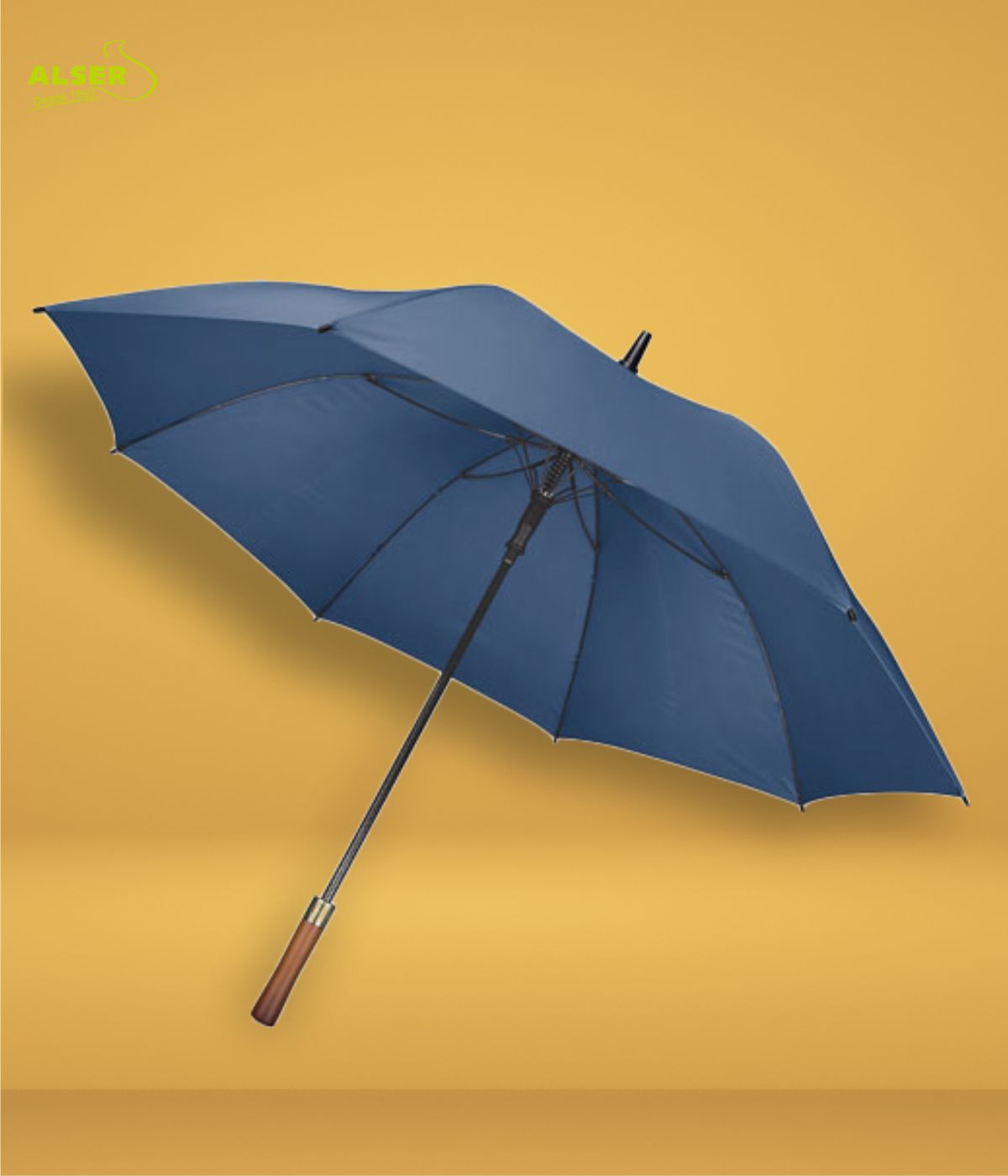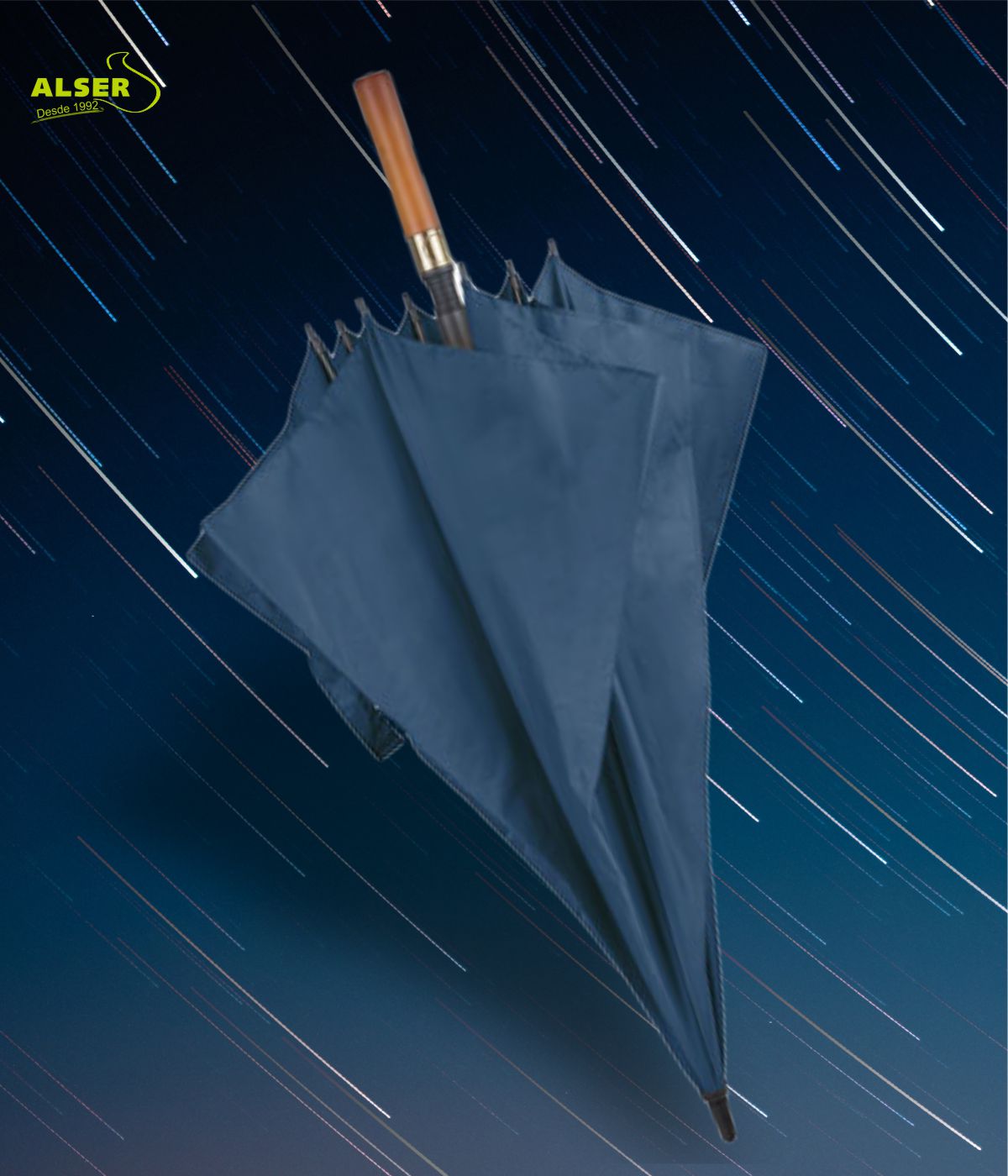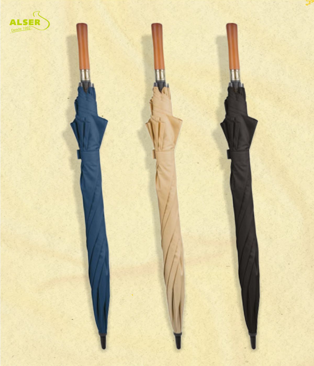 Su mango recto de madera natural, las varillas y tensores de fibra, y una apertura automática, es la combinación perfecta de moda y funcionalidad.