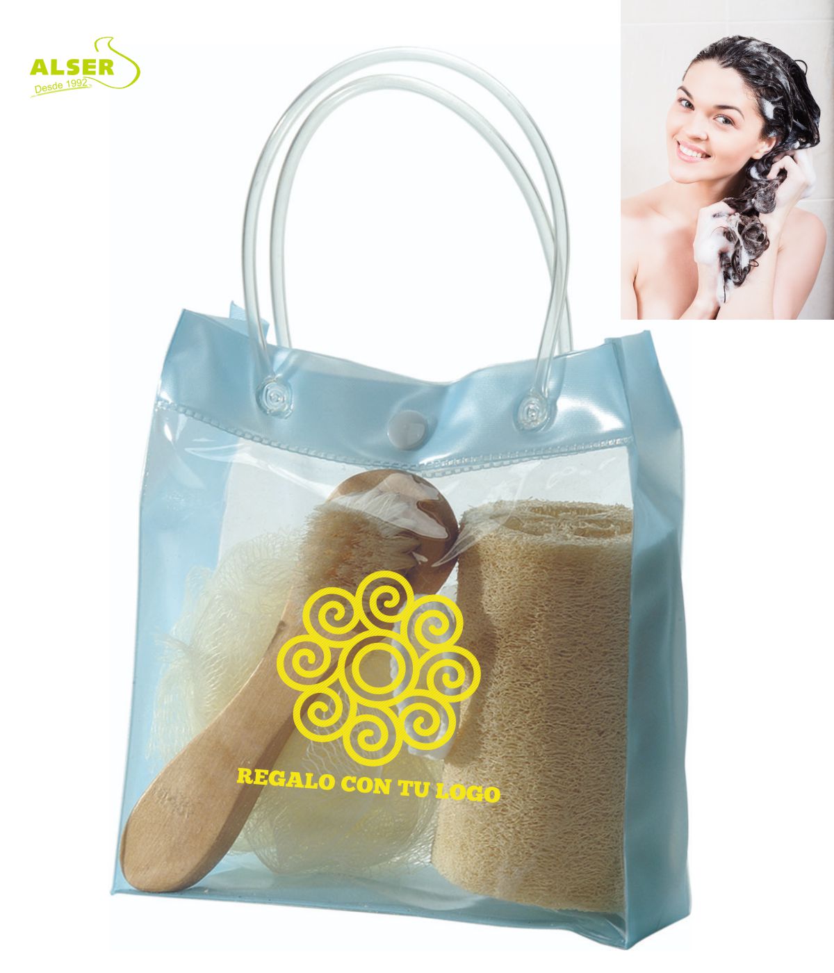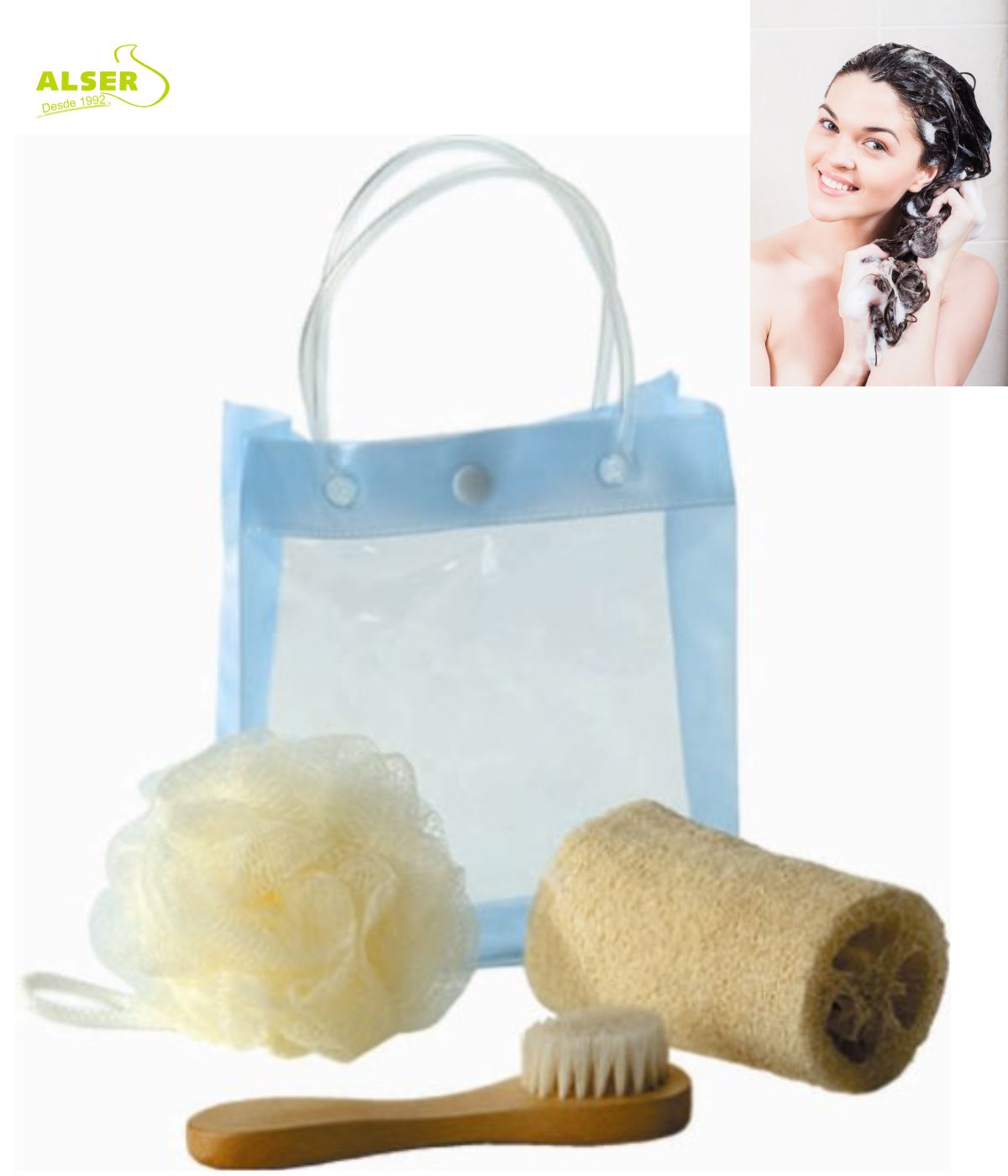 • Set de baño con tres piezas presentado en una bolsa translucida con asa para llevar y fabricada en PVC.