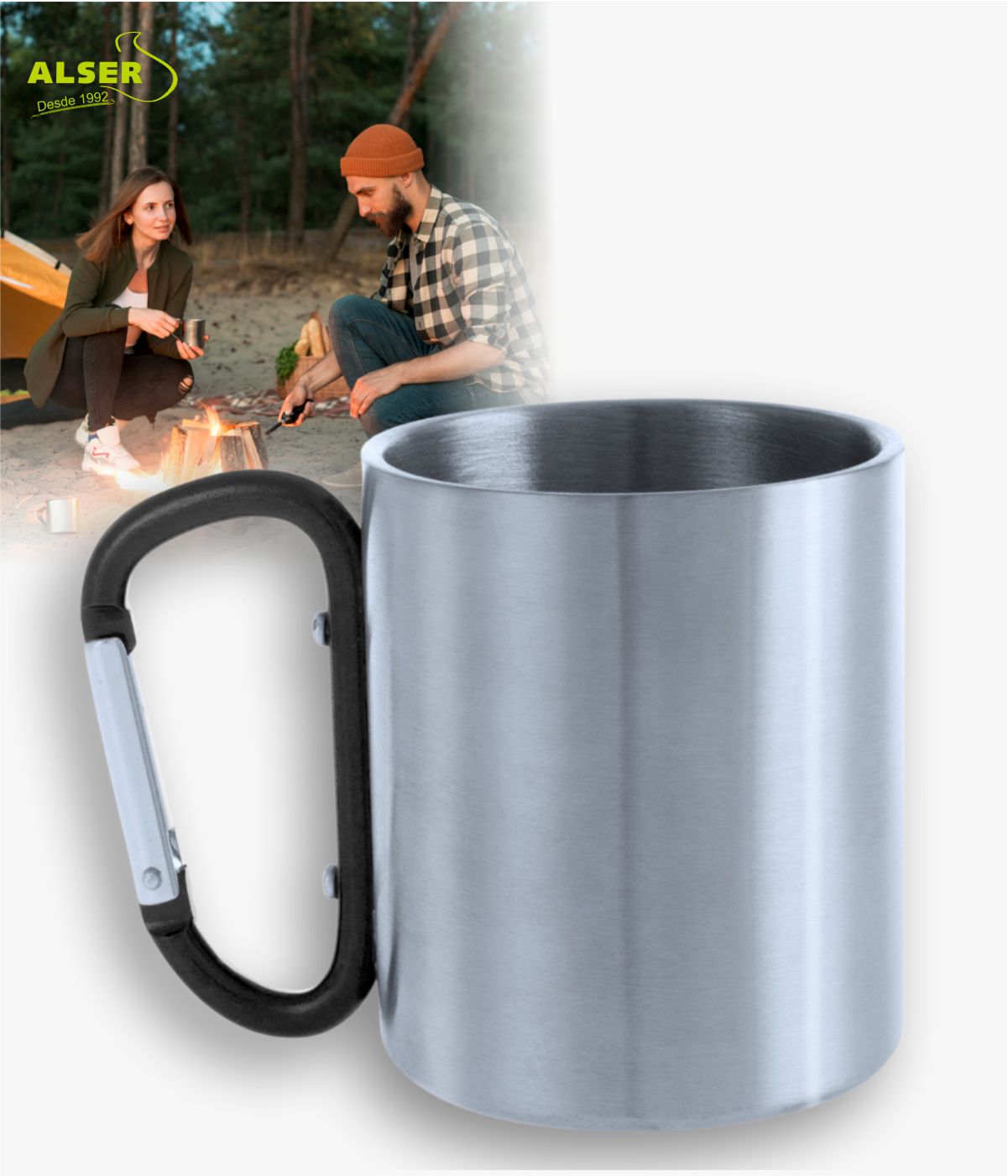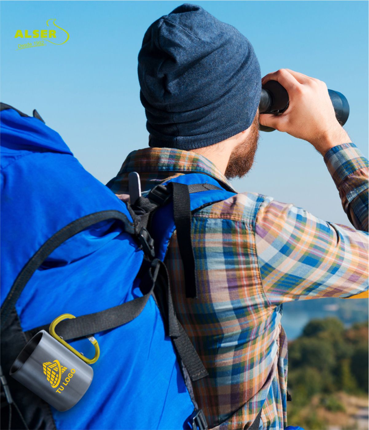 Hay regalos promocionales que no salen nunca de casa, y luego está la taza camping: ligera, resistente, original y siempre lista para subir una montaña o irse a nadar al rio. Fabricada en acero inoxidable de doble pared, mantiene la temperatura y evita quemaduras, algo que agradecen tus dedos cuando el café caliente acompaña el amanecer en la montaña. Y su asa no es un asa: es un mosquetón. Sí, un mosquetón de verdad, para colgarla de mochilas, cinturones o trabillas del pantalón. ¡Es una taza mas curiosa que Dora la exploradora!